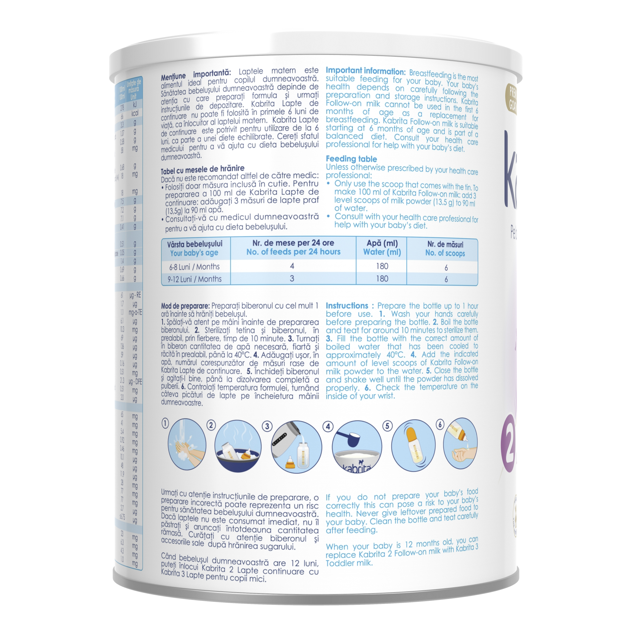 Urmați cu atenție instrucțiunile de preparare, o preparare incorectă poate reprezenta un risc pentru sănătatea bebelușului dumneavoastră. Dacă laptele nu este consumat imediat, nu îl păstrați şi aruncați întotdeauna cantitatea rămasă. Curățați cu atenție biberonul şi accesoriile sale după hrănirea sugarului. De la 12 luni, puteți înlocui Kabrita 2 Lapte de continuare cu Kabrita 3 Lapte pentru copii mici, după consultarea medicului dumneavoastră.