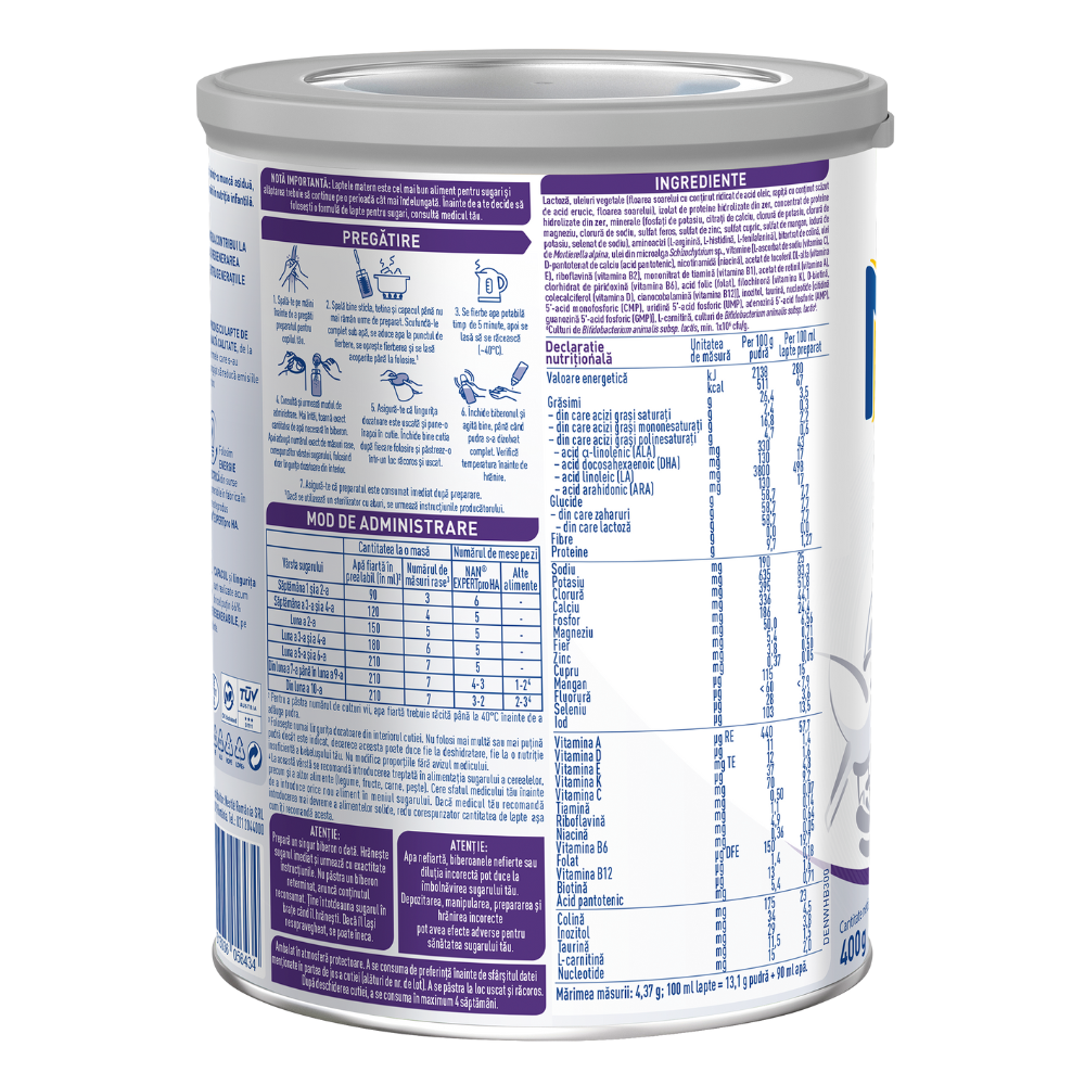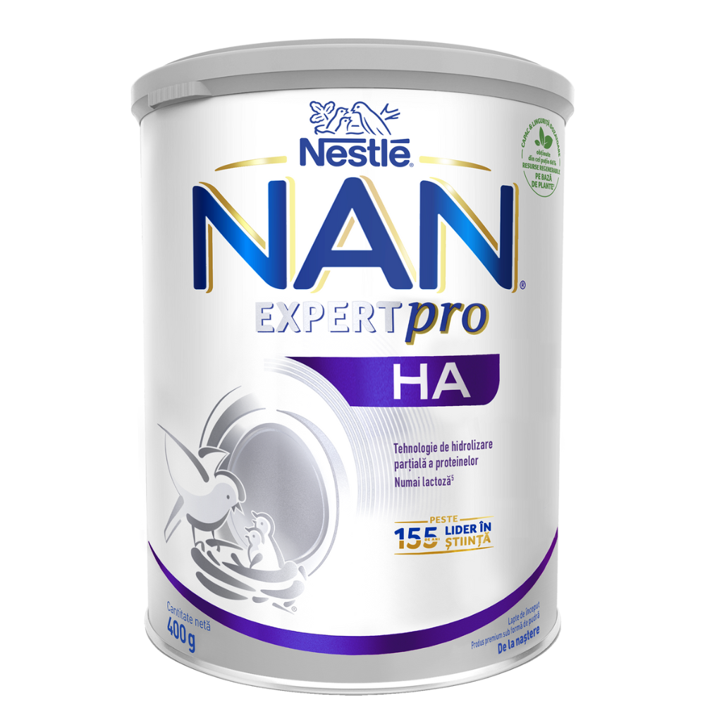 Dacă sugarul tău are alergie la proteinele laptelui de vacă, nu folosi NAN® EXPERTpro HA fără a consulta medicul tău. Introducerea în alimentație a oricărei formule de lapte sau a laptelui de vacă trebuie făcută numai sub supraveghere medicală.