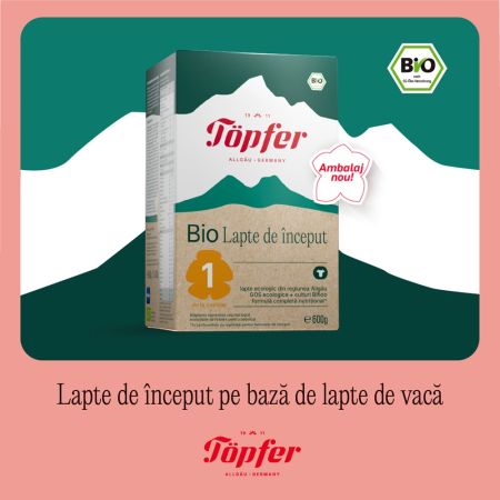Töpfer Bio 1 este un lapte de început ecologic, pe bază de lapte de vacă, destinat alimentației sugarilor de la naștere. Formula este adaptată nevoilor nutriționale ale bebelușilor în primele luni de viață și poate fi utilizată ca unică sursă de hrană atunci când alăptarea nu este posibilă sau ca aliment complementar alăptării.