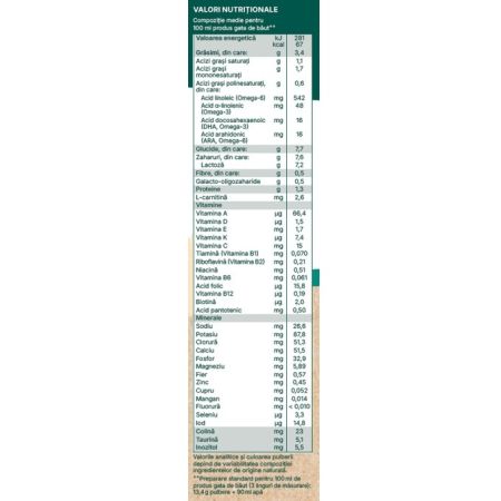 Lapte degresat¹, pulbere din zer parțial demineralizat, uleiuri vegetale* (ulei de palmier², ulei de floarea-soarelui, ulei de rapiță*), lactoză*, galacto-oligozaharide din lactoză*, lapte praf degresat*¹, ulei din microalga Schizochytrium sp., ulei din Mortierella alpina, minerale și vitamine, culturi de bifidobacterii (B. breve, B. bifidum, B. infantis, B. longum).