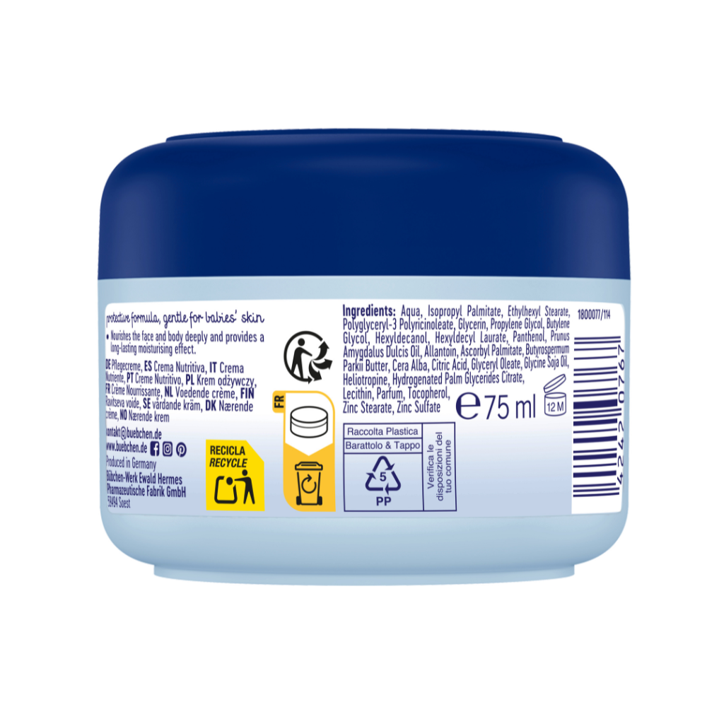 Aqua, Isopropyl Palmitate, Ethylhexyl Sterate, Polyglyceryl-3, Polyricinoleate, Glycerin, , Polyricinoleate Glycerin, Propylene Glycol, Butylene Glycol, Hexyldecanol, Hexyldecyl Laurate, Pantehnol, Prunus Amygdalus Dulcis Oil, Allatoin, Ascorbyl Palmitate, Butyrospermum Parkii Butter, Cera Alba, Citric Acid, Glyceryl Oleate, Glycine Soja Oil, Helitropine, Hydrogenated Palm Glycerides Citrate, Lecithin, Parfum, Tocopherol, Zinc Sterate, Zinc Sulfate.