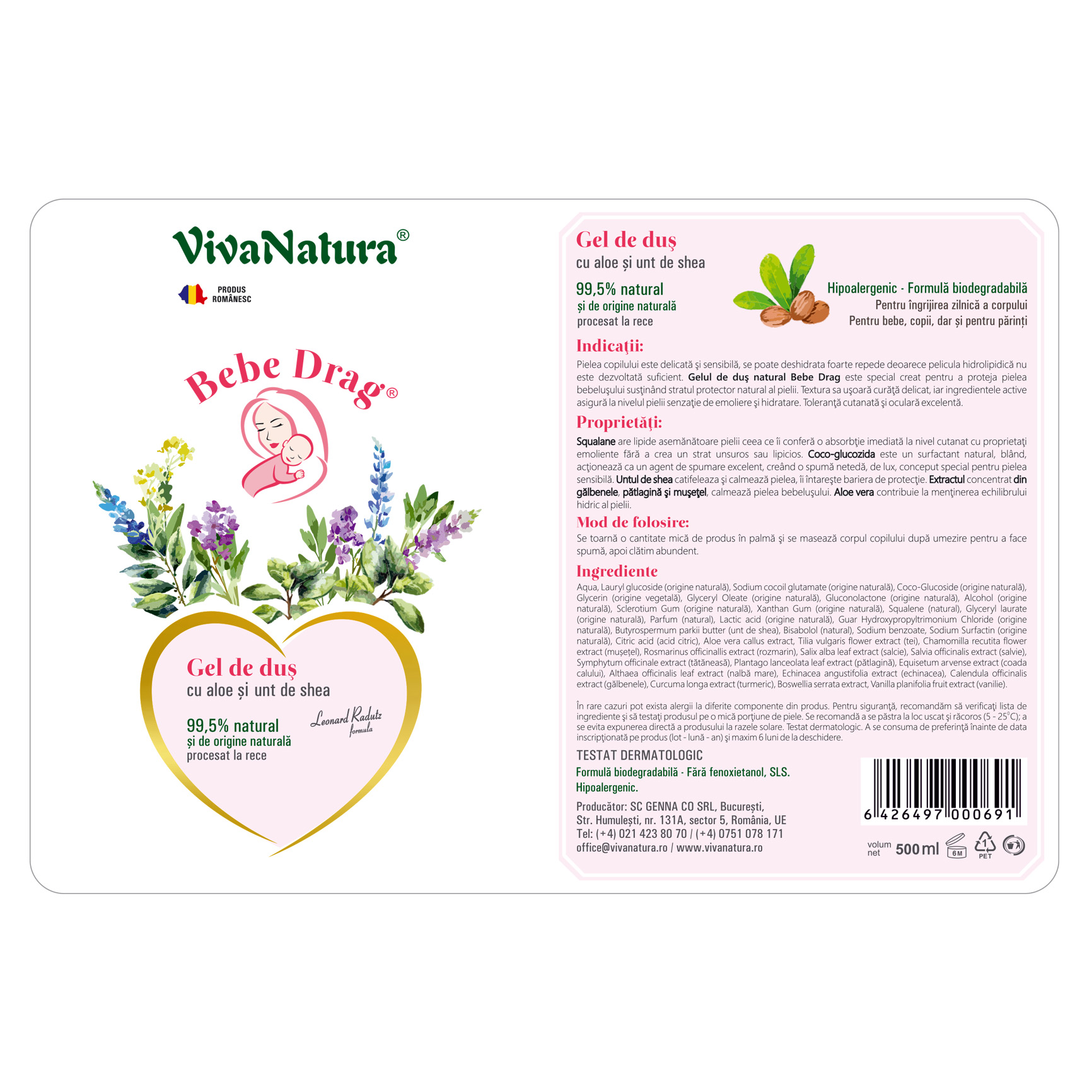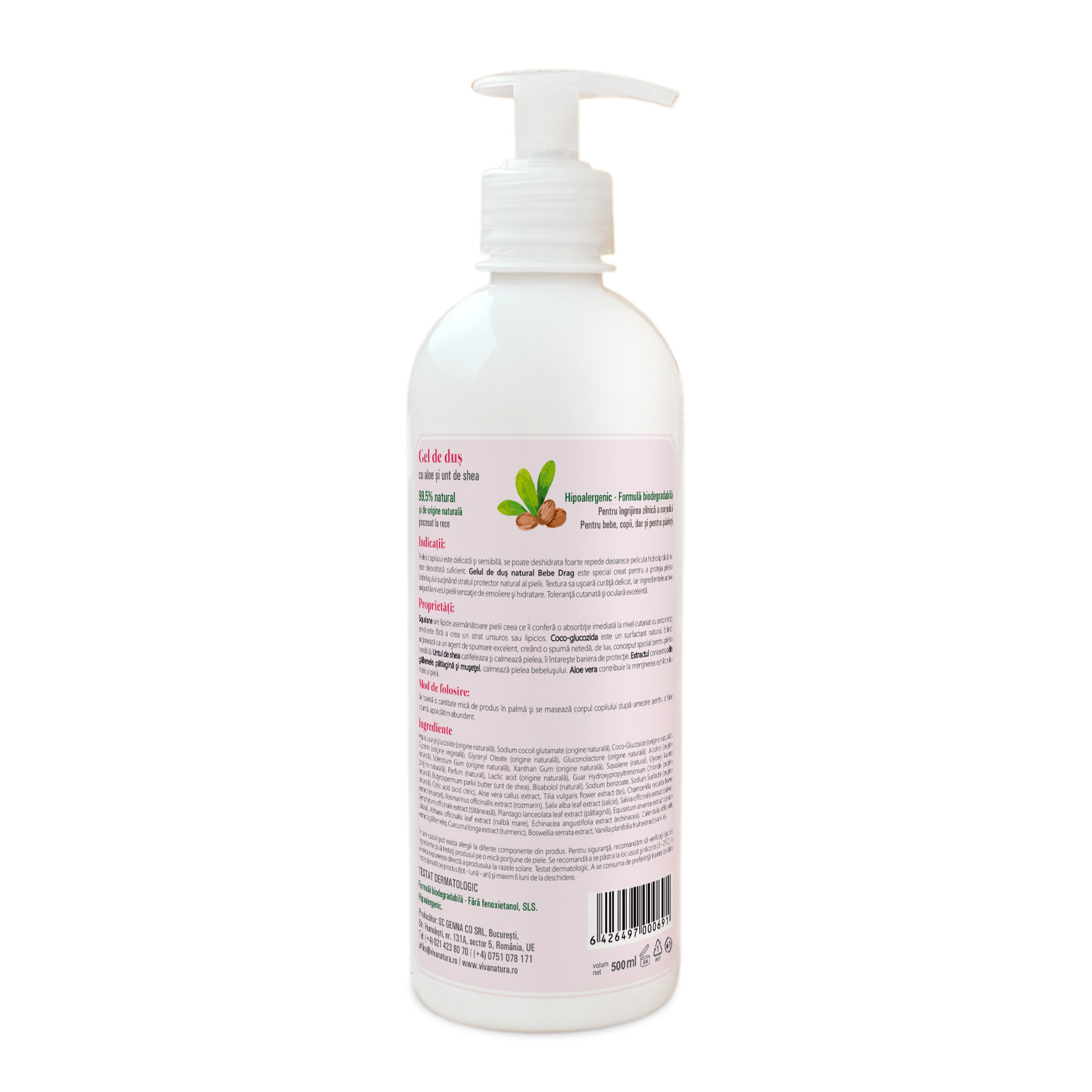 Pielea copilului este delicată şi sensibilă, se poate deshidrata foarte repede deoarece pelicula hidrolipidică nu este dezvoltată suficient. Gelul de duş natural Bebe Drag este special creat pentru a proteja pielea bebeluşului susţinând stratul protector natural al pielii. Textura sa uşoară curăţă delicat, iar ingredientele active asigură la nivelul pielii senzaţie de emoliere şi hidratare. Toleranţă cutanată şi oculară excelentă.