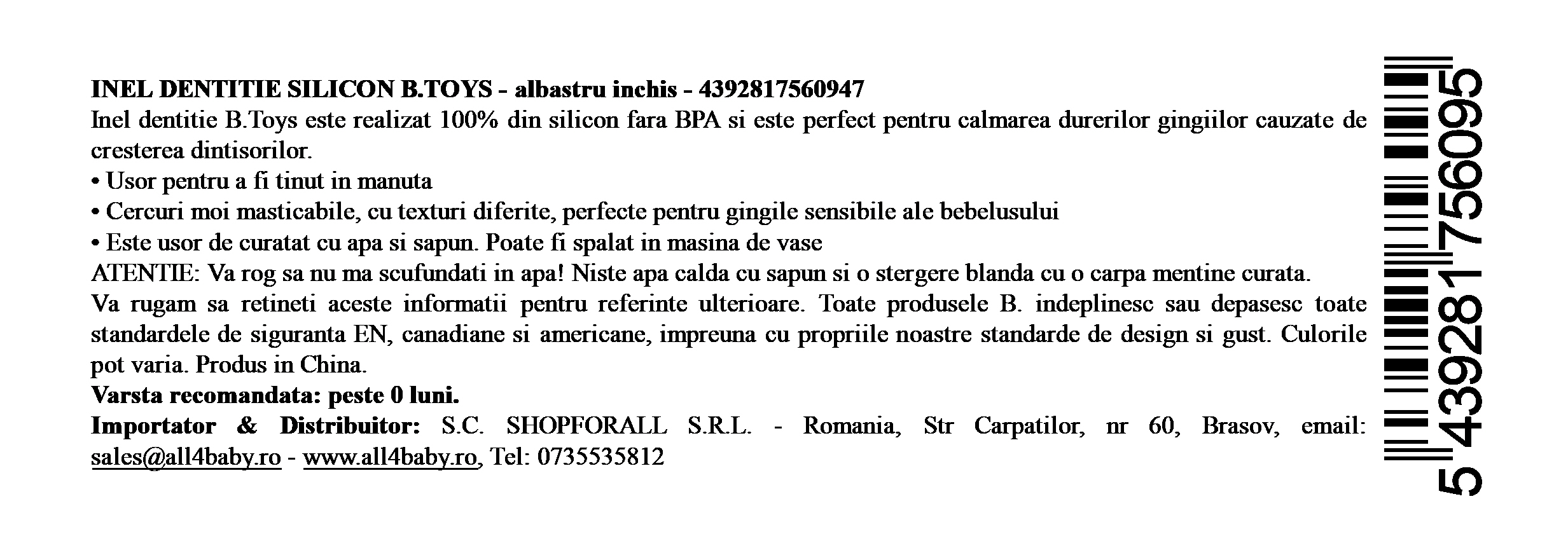 Inelul de dentiție B.Toys, realizat 100% din silicon, este conceput pentru a oferi confort bebelușului în perioada erupției dentare. Texturile variate și materialul moale ajută la calmarea disconfortului gingival, stimulând în același timp explorarea senzorială.