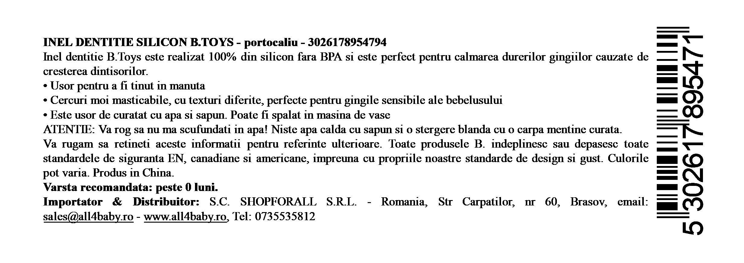 Ultima actualizare a informatiilor de prezentare pentru Inel dentitie din silicon, Portocaliu, + 0 luni, Btoys a fost efectuata la data de 19-04-2026.  |  Raporteaza Descriere Gresita