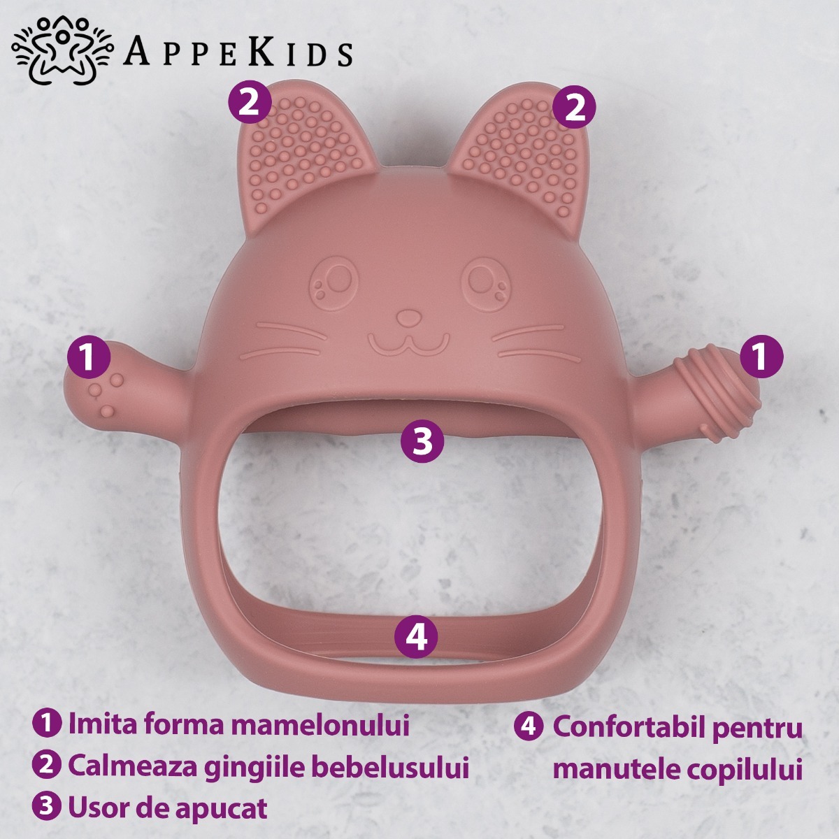Jucarie pentru dentitie din silicon, Old Rose, Manusa Kitty, 3 luni+, Appekids [5941944276029]