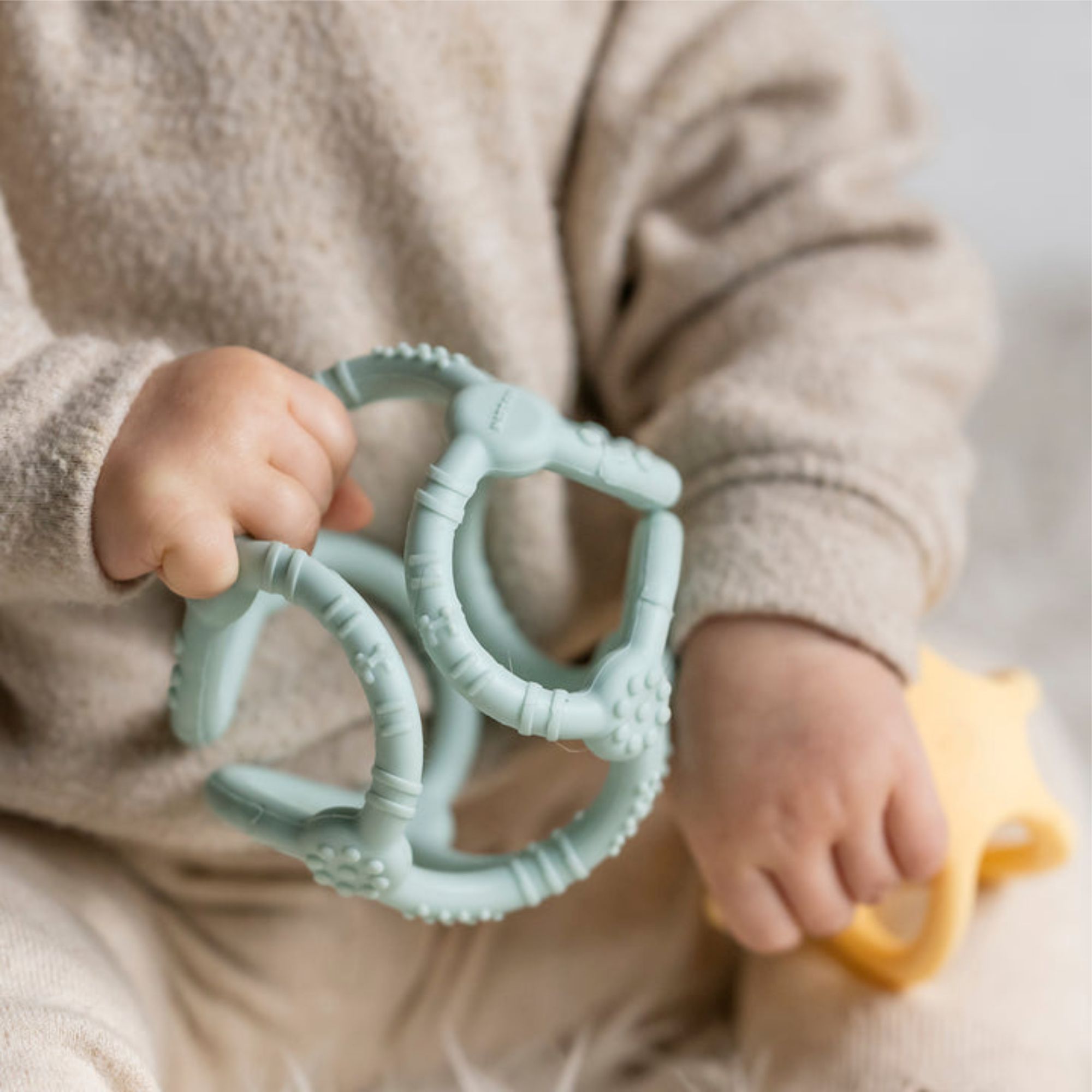 Se oferă bebelușului pentru a fi mușcat și manipulat în perioadele de disconfort gingival.