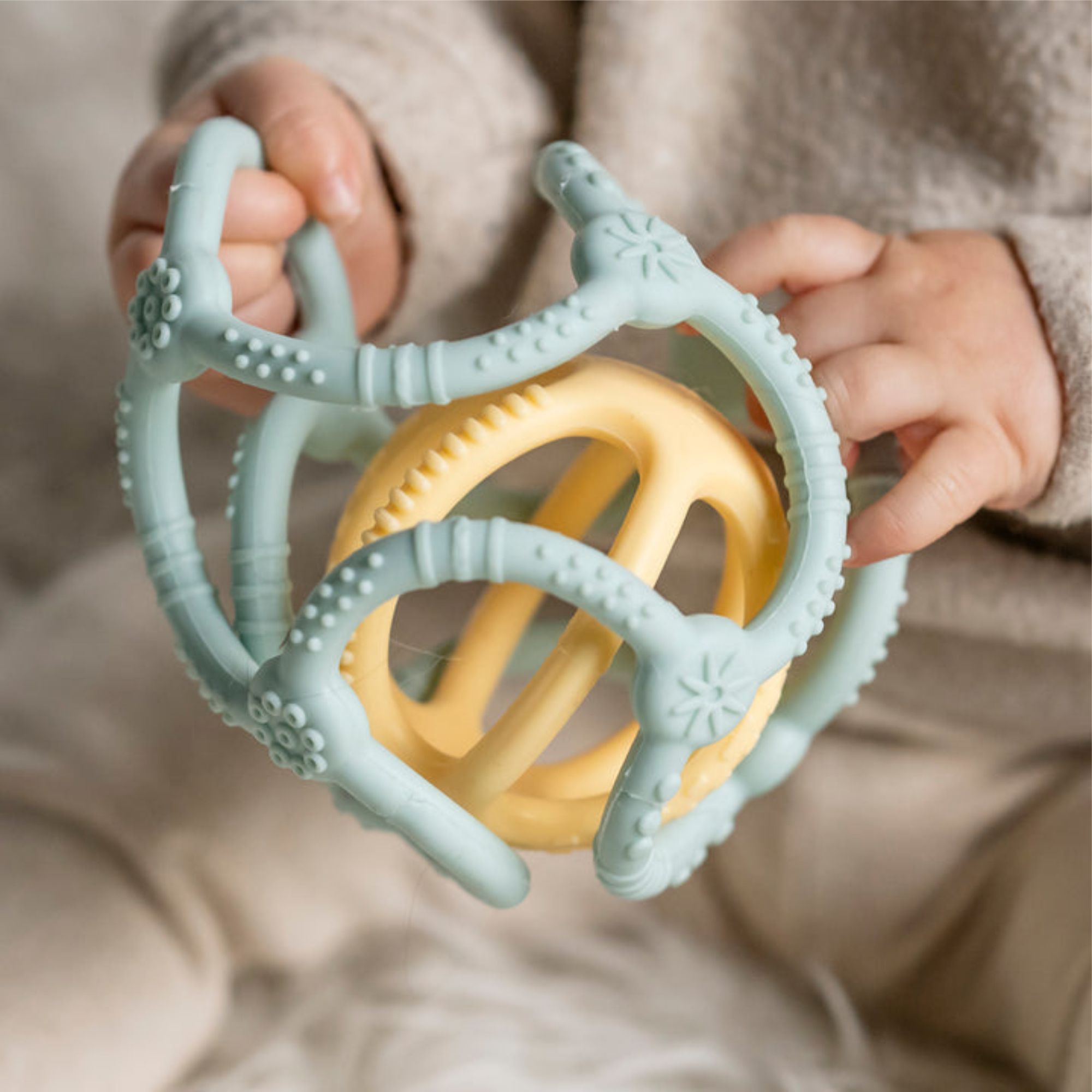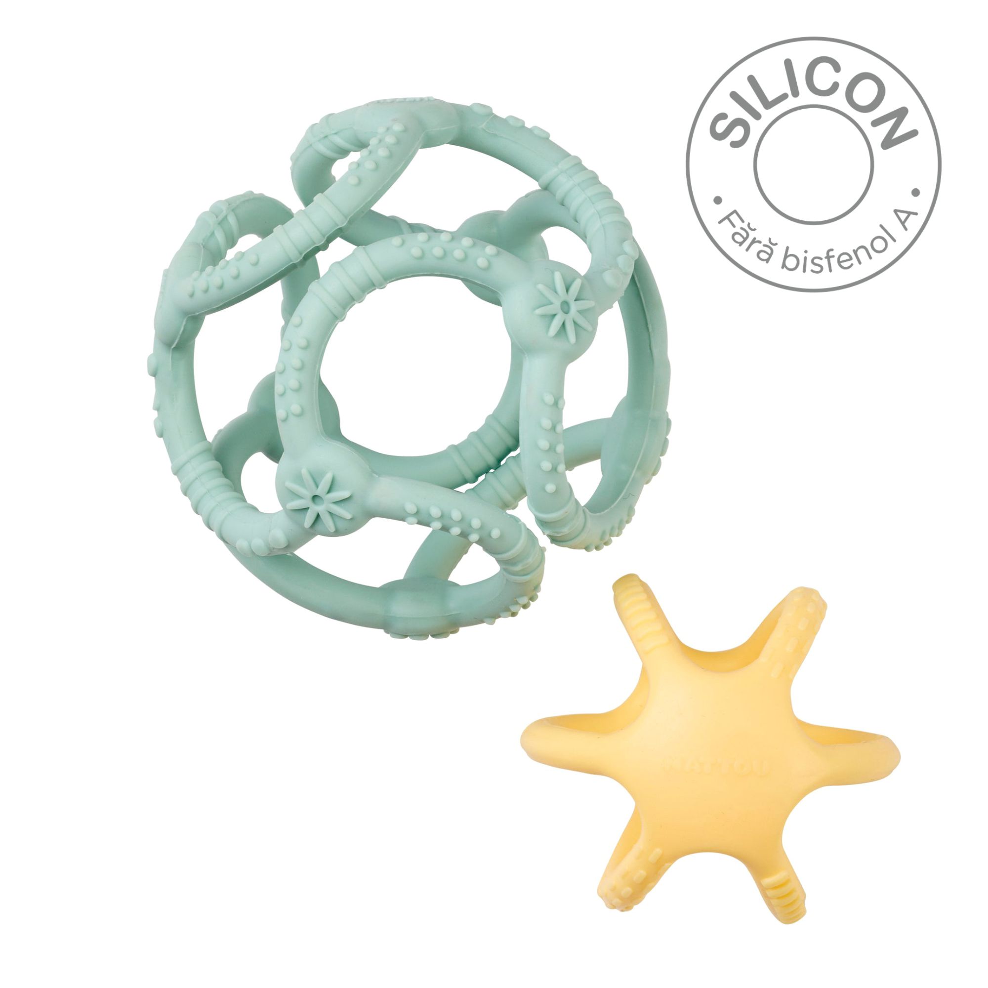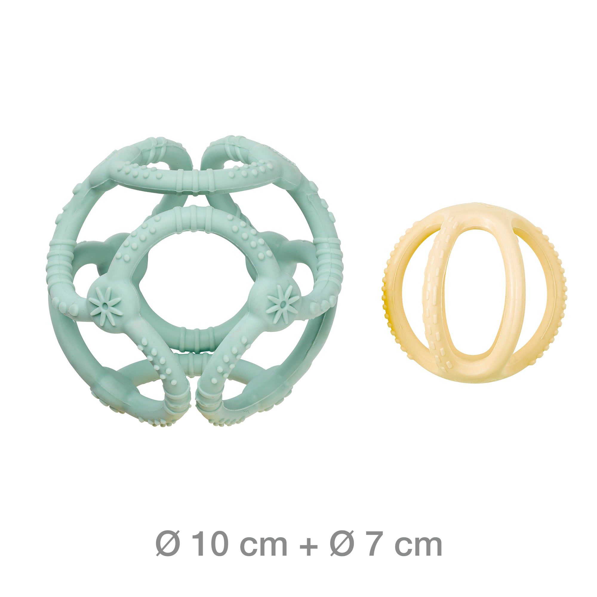 Setul conține două mingi din silicon, special concepute pentru a calma gingiile sensibile ale bebelușilor în perioada erupției dentare. Datorită designului colorat, atractiv și ușor de prins, acestea devin rapid un companion ideal pentru cei mici, fie acasă, fie în deplasare.