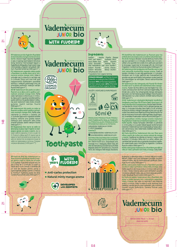 Pasta de dinti bio pentru copii Vademecum Mango, 50 ml este special formulata pentru igiena orala a copiilor cu varsta de peste 6 ani. Cu o aroma placuta de mango si menta, aceasta pasta transforma periajul intr-o experienta agreabila, contribuind in acelasi timp la protectia eficienta a dintilor. Formula contine fluor pentru intarirea smaltului si prevenirea cariilor.
