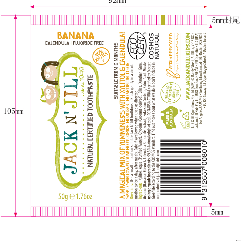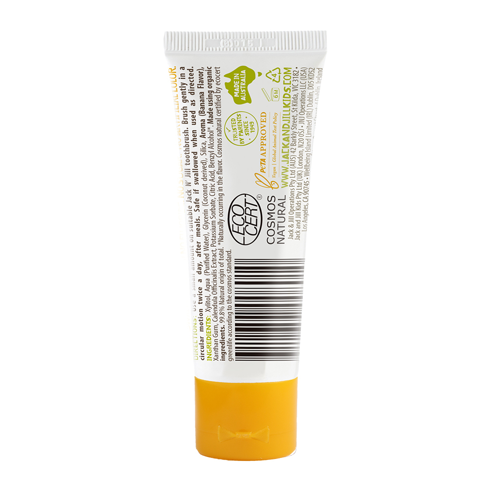 Pasta de dinti naturala pentru copii Jack n' Jill, cu aroma de banane, special conceputa pentru igiena orala zilnica a copiilor inca de la 6 luni, fara fluor si fara ingrediente agresive.