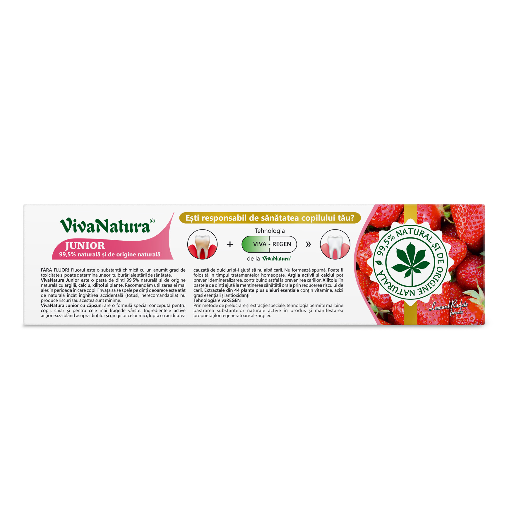 VivaNatura Junior cu căpşuni are o formulă special concepută pentru copii, chiar și pentru cele mai fragede vârste. Ingredientele active acţionează blând asupra dinților şi gingiilor celor mici, luptă cu aciditatea cauzată de dulciuri și-i ajută să nu aibă carii. Nu formează spumă. Poate fi folosită in timpul tratamentelor homeopate. Argila activă şi calciul pot preveni demineralizarea, contribuind astfel la prevenirea cariilor. Xilitolul în pastele de dinți ajută la menţinerea sănătăţii orale prin reducerea riscului de carii. Extractele din 44 plante plus uleiuri esențiale conţin vitamine, acizi graşi esenţiali și antioxidanţi.