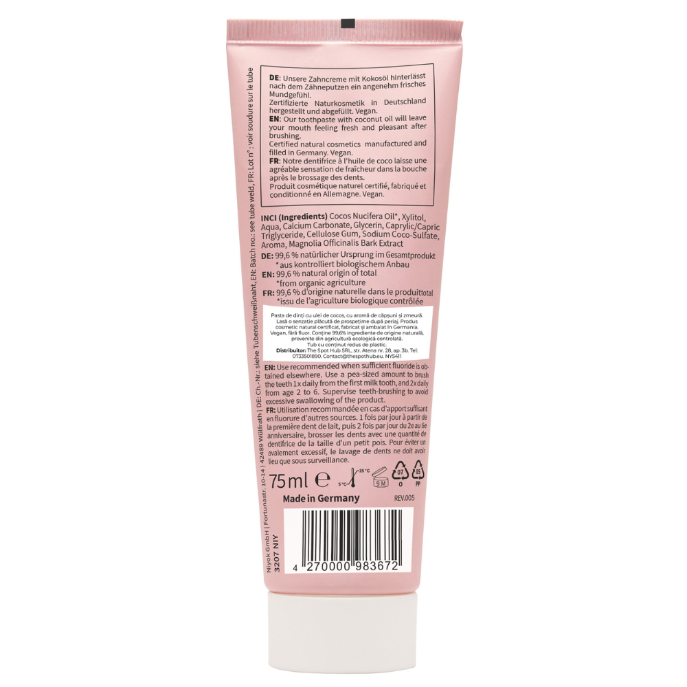 Cocos Nucifera Oil (din agricultură ecologică controlată), Xylitol, Aqua, Calcium Carbonate, Glycerin, Caprylic/Capric Triglyceride, Cellulose Gum, Sodium Coco-Sulfate, Aroma, Magnolia Officinalis Bark Extract.