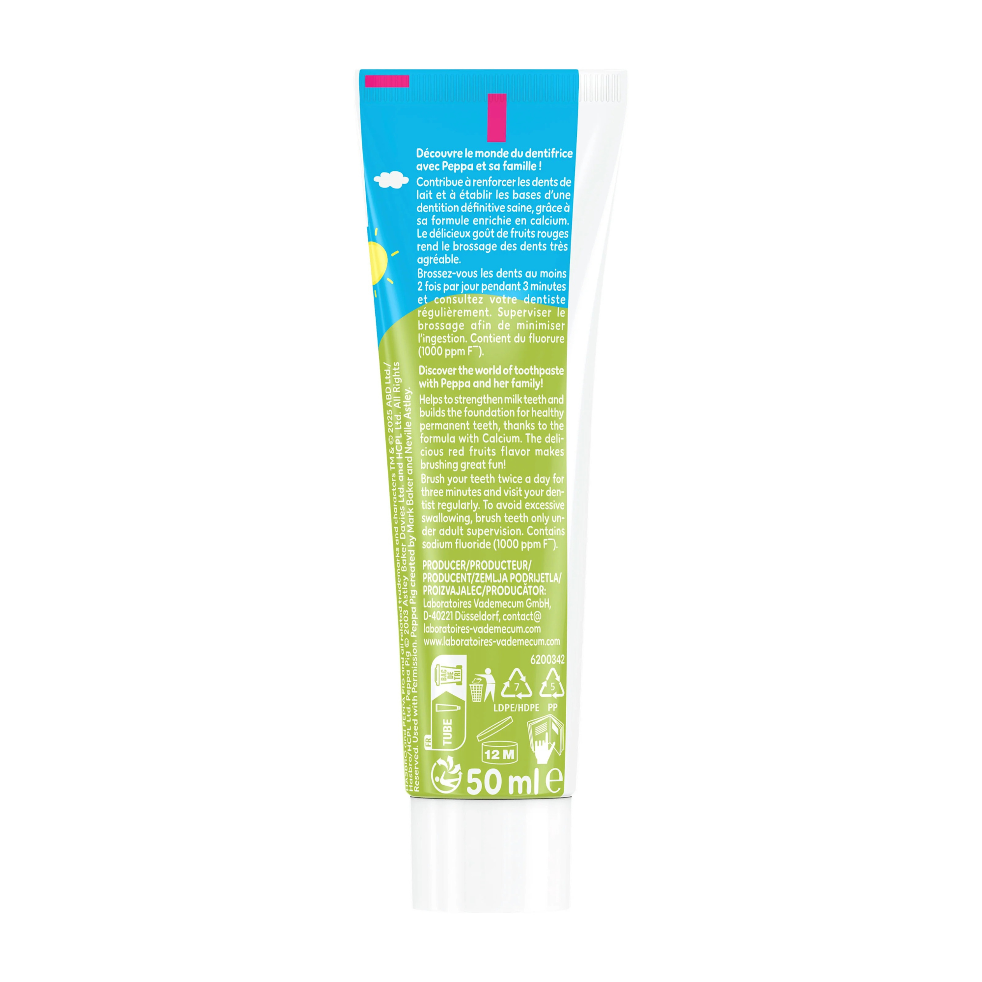 Vademecum x Peppa Pasta de dinti pentru copii 0-6 ani este special formulata pentru protectia dintilor de lapte, oferind protectie impotriva cariilor si o experienta placuta datorita aromei delicioase de fructe rosii (capsuni, zmeura si cirese). Formula contine fluor si nu contine zahar.