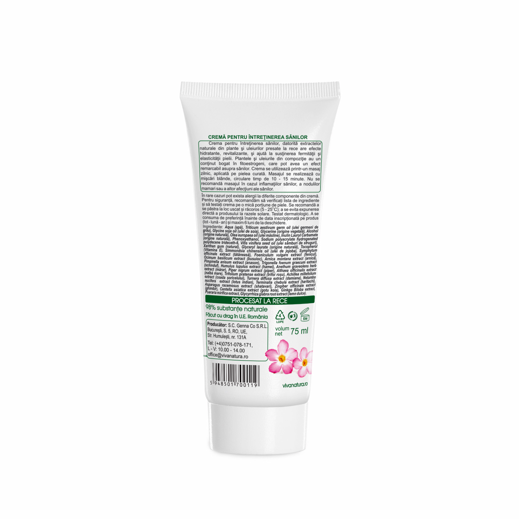 Crema pentru întreţinerea sânilor, datorită extractelor naturale din plante şi uleiurilor presate la rece are efecte hidratante, revitalizante, şi ajută la susţinerea fermităţii şi elasticităţii pielii. Plantele şi uleiurile din compoziţie au un continut bogat în fitoestrogeni, care pot avea un efect remarcabil asupra sânilor. Crema se utilizează printr-un masaj zilnic, aplicată pe pielea curată. Masajul se realizează cu mişcări blânde, circulare timp de 10 15 minute. Nu se recomandă masajul în cazul inflamaţiilor sânilor, a nodulilor mamari sau a altor afecţiuni ale sânilor.