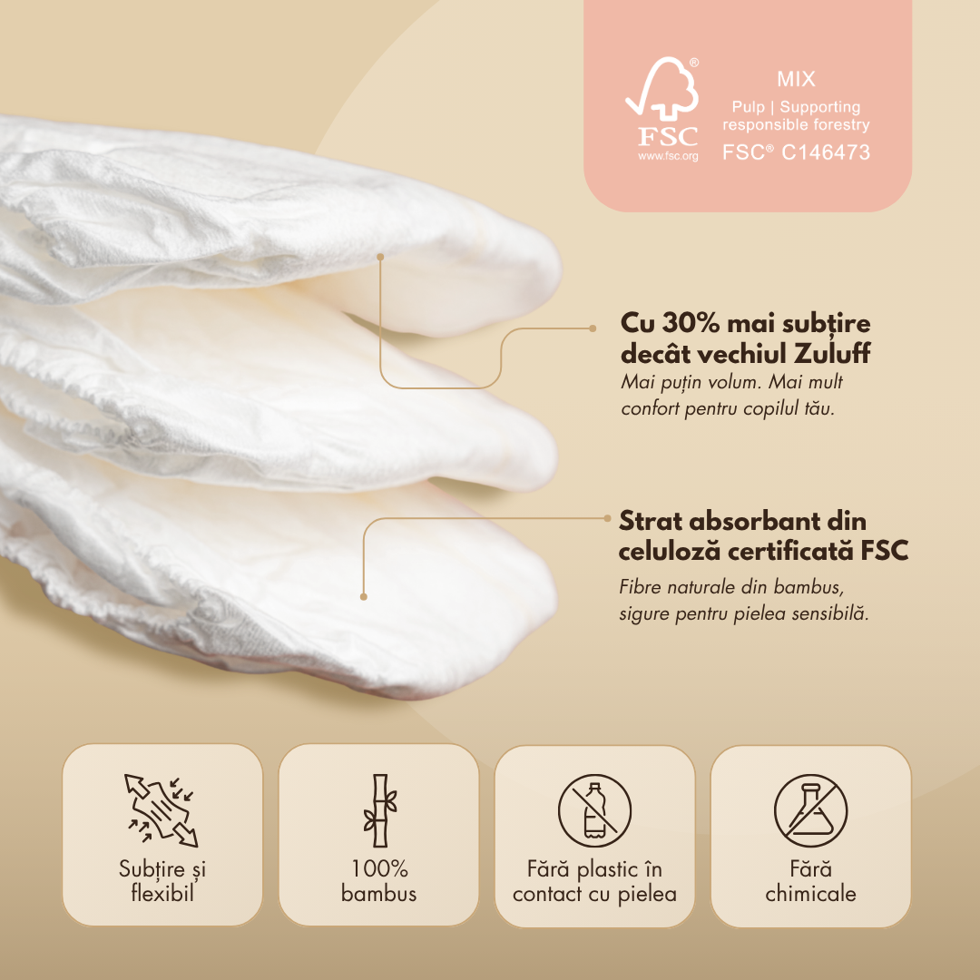 Materiale: bambus natural, celuloză fără clor (TCF), granule super absorbante, elastice din spandex, lipici pe bază de apă