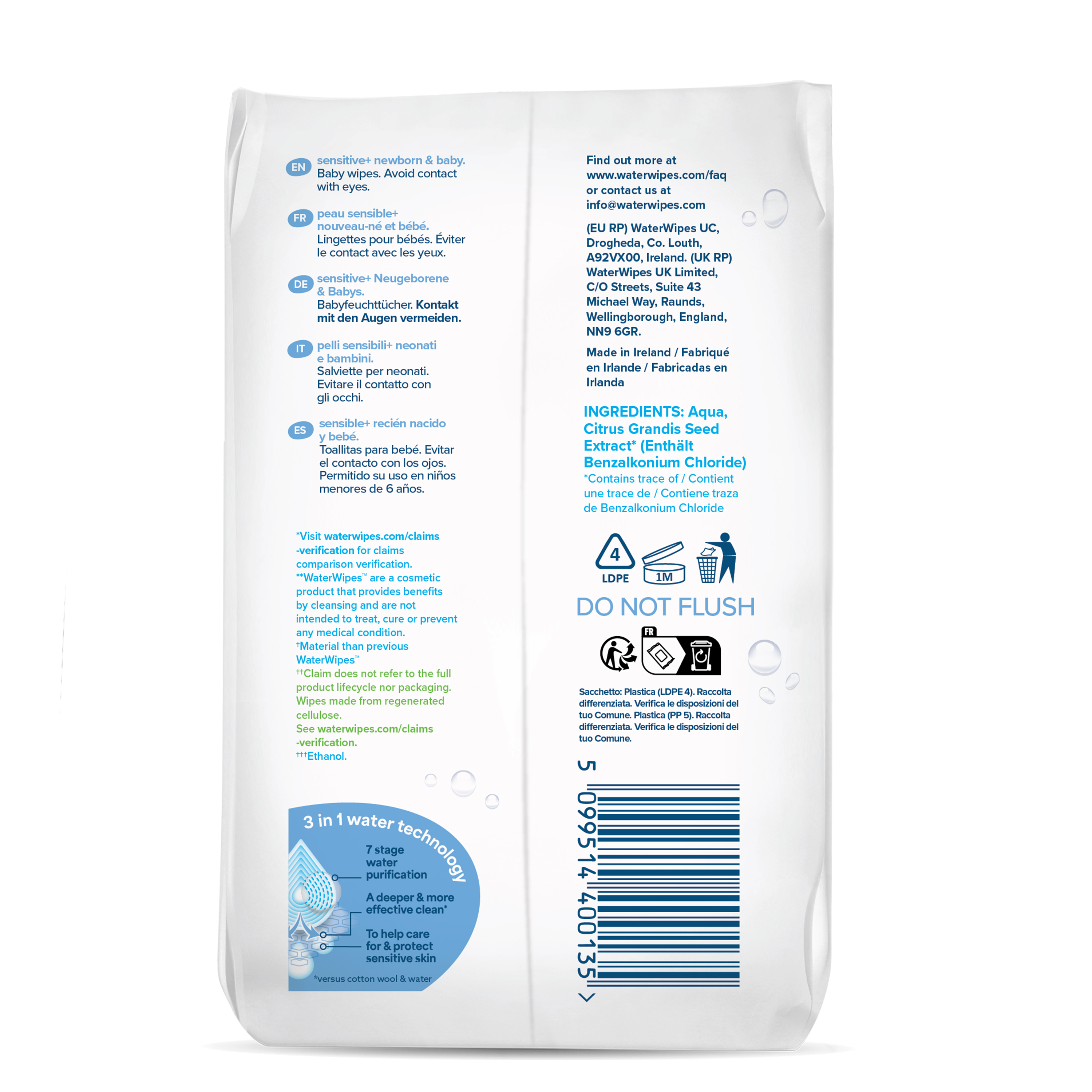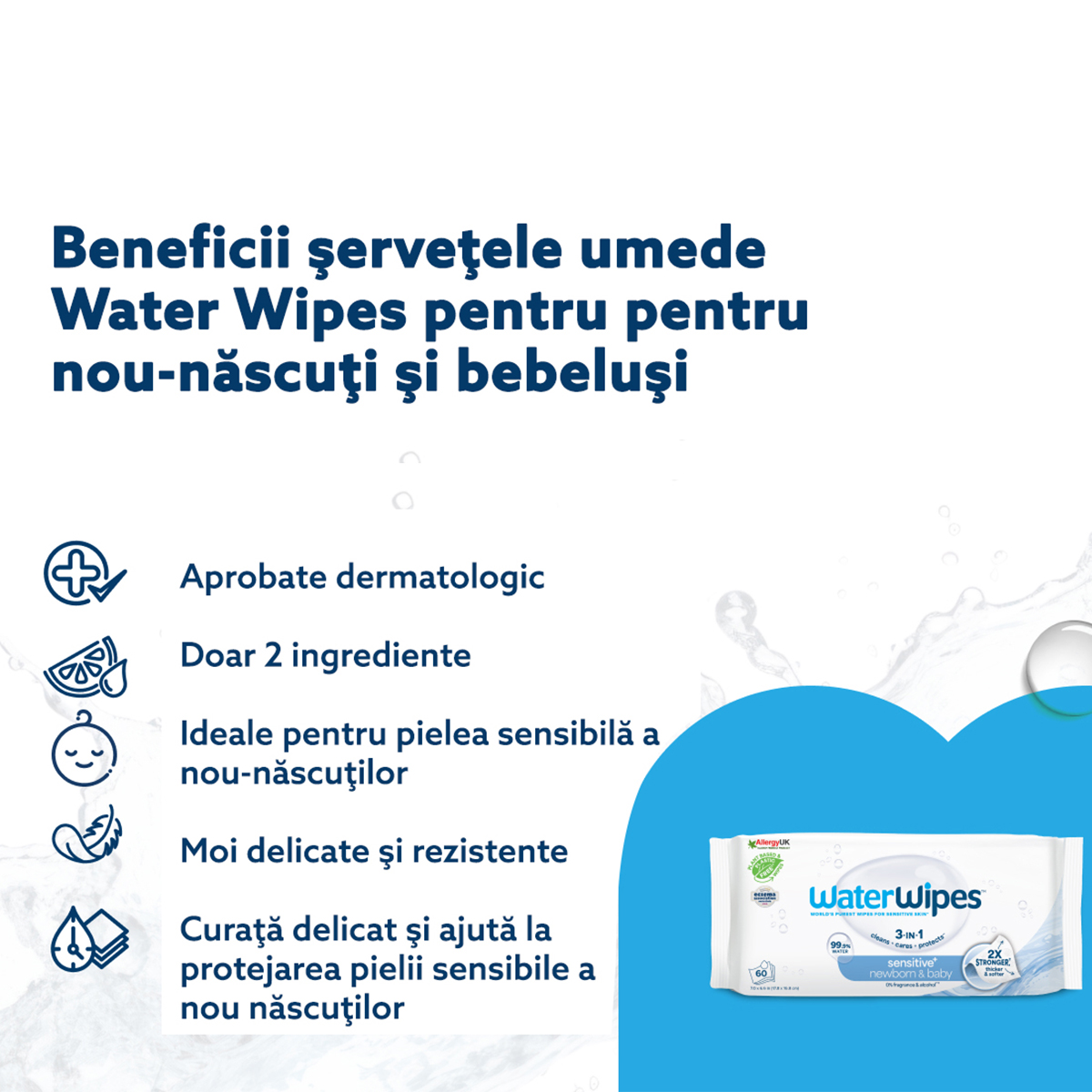 WaterWipes - Servetele umede Sensitive + pentru nou-nascuti si bebelusi. Formula 3 in 1: Curata + Ingrijeste + Protejeaza*. 99,9% apa, fara parfum, hipoalergenice.