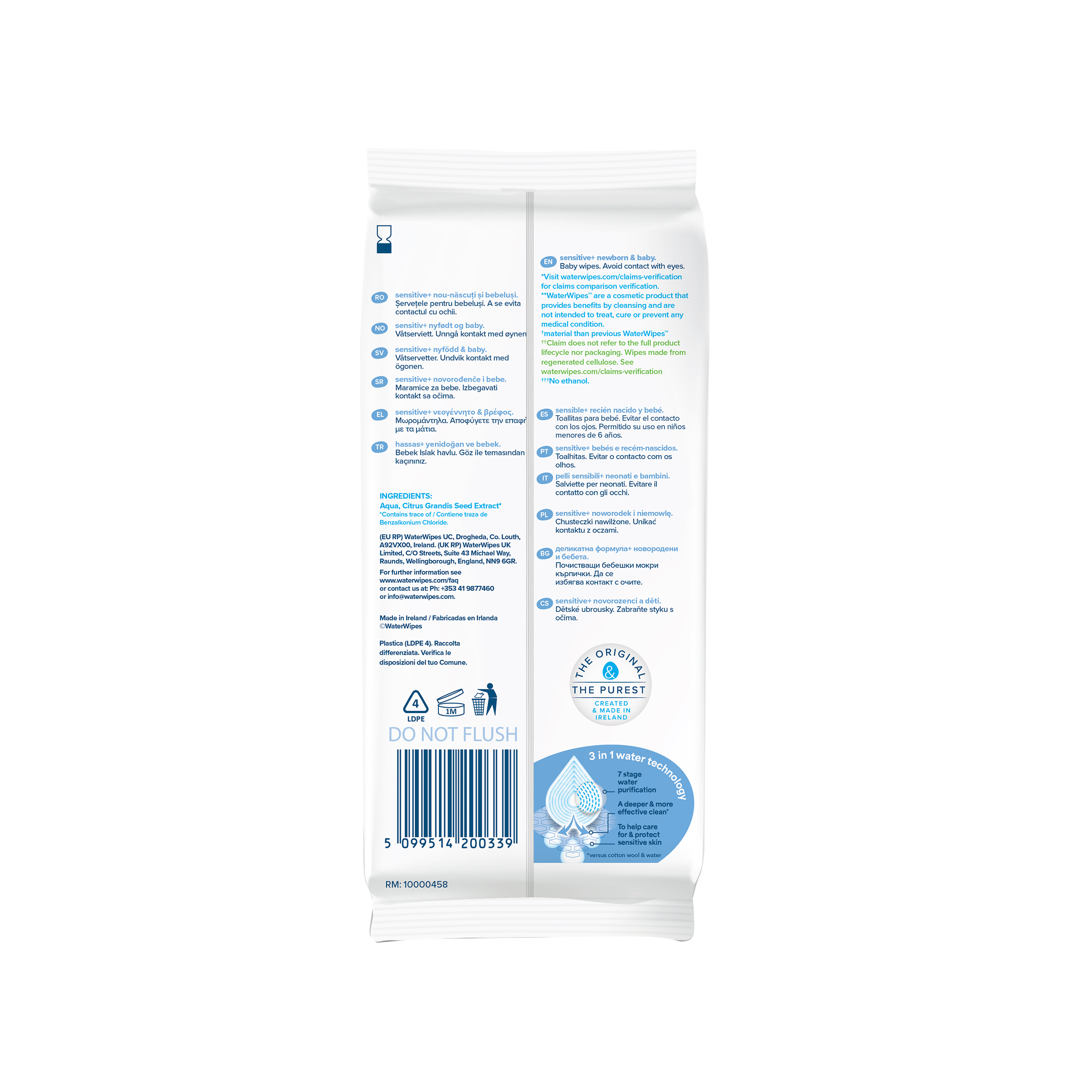 WaterWipes Sensitive+ sunt șervețele umede special concepute pentru nou-născuți și bebeluși, având o formulă 3 în 1: Curăță + Îngrijește + Protejează. Realizate din 99,9% apă purificată și o picătură de extract de fructe, aceste șervețele sunt hipoalergenice, fără parfum și blânde chiar și cu pielea celor mai mici, inclusiv a prematurilor.