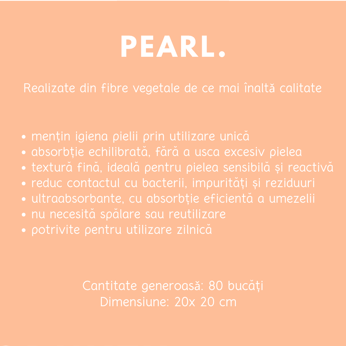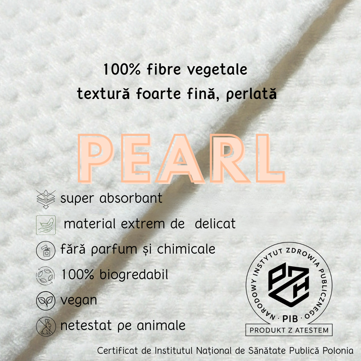 Textura perlata, fina si uniforma, contribuie la o atingere delicata si la o absorbtie eficienta, fara a agresa pielea sau a provoca disconfort. Pot fi utilizate atat uscate, pentru tamponarea fetei dupa curatare, cat si umede, pentru demachiere sau pentru indepartarea mastilor cosmetice. Datorita texturii extrem de moi, sunt potrivite inclusiv pentru pielea sensibila sau reactiva.