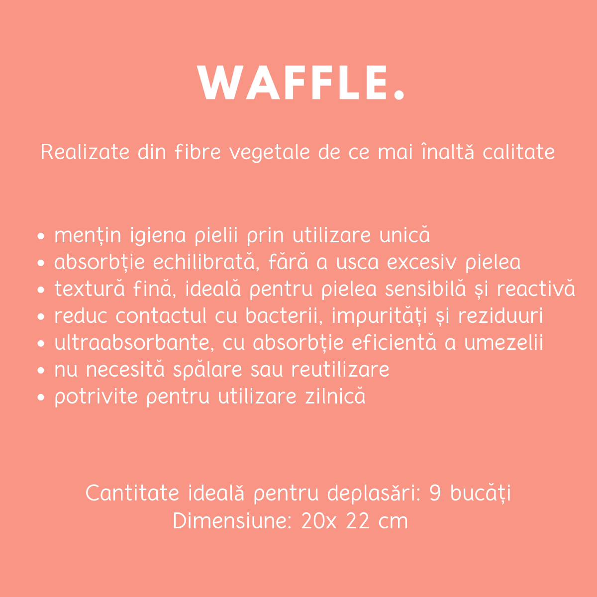 Structura tip waffle sustine o absorbtie eficienta a umezelii, ceea ce le face potrivite pentru uscarea fetei dupa curatare, pentru demachiere sau pentru indepartarea mastilor cosmetice. Textura moale si non-agresiva le recomanda pentru toate tipurile de ten, inclusiv pentru pielea sensibila sau reactiva, fara a perturba echilibrul pielii si fara a usca excesiv.