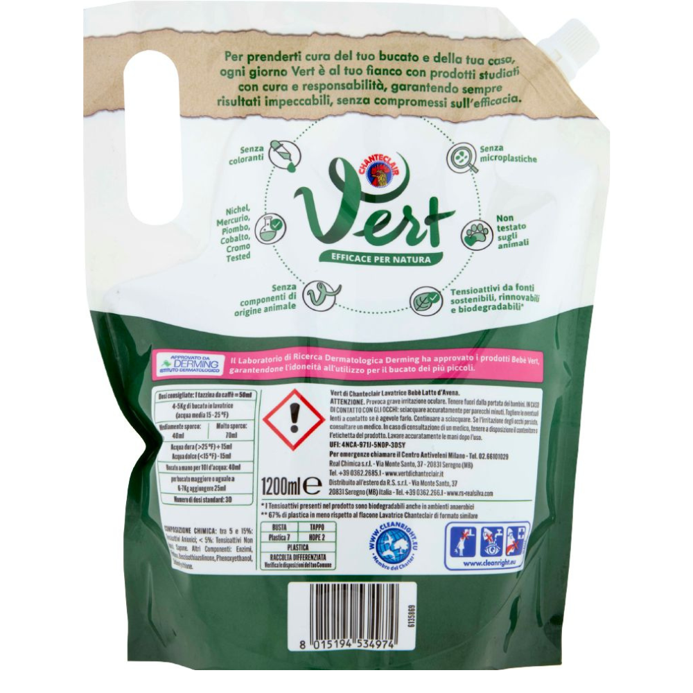 Bebe Detergent Vert cu lapte de ovaz este un detergent lichid ecologic pentru rufe de bebelusi, conceput pentru a oferi curatare eficienta si protectie delicata pentru pielea sensibila. Formula sa concentrata cu lapte de ovaz indeparteaza eficient petele specifice copiilor, pastrand in acelasi timp tesaturile moi si confortabile.