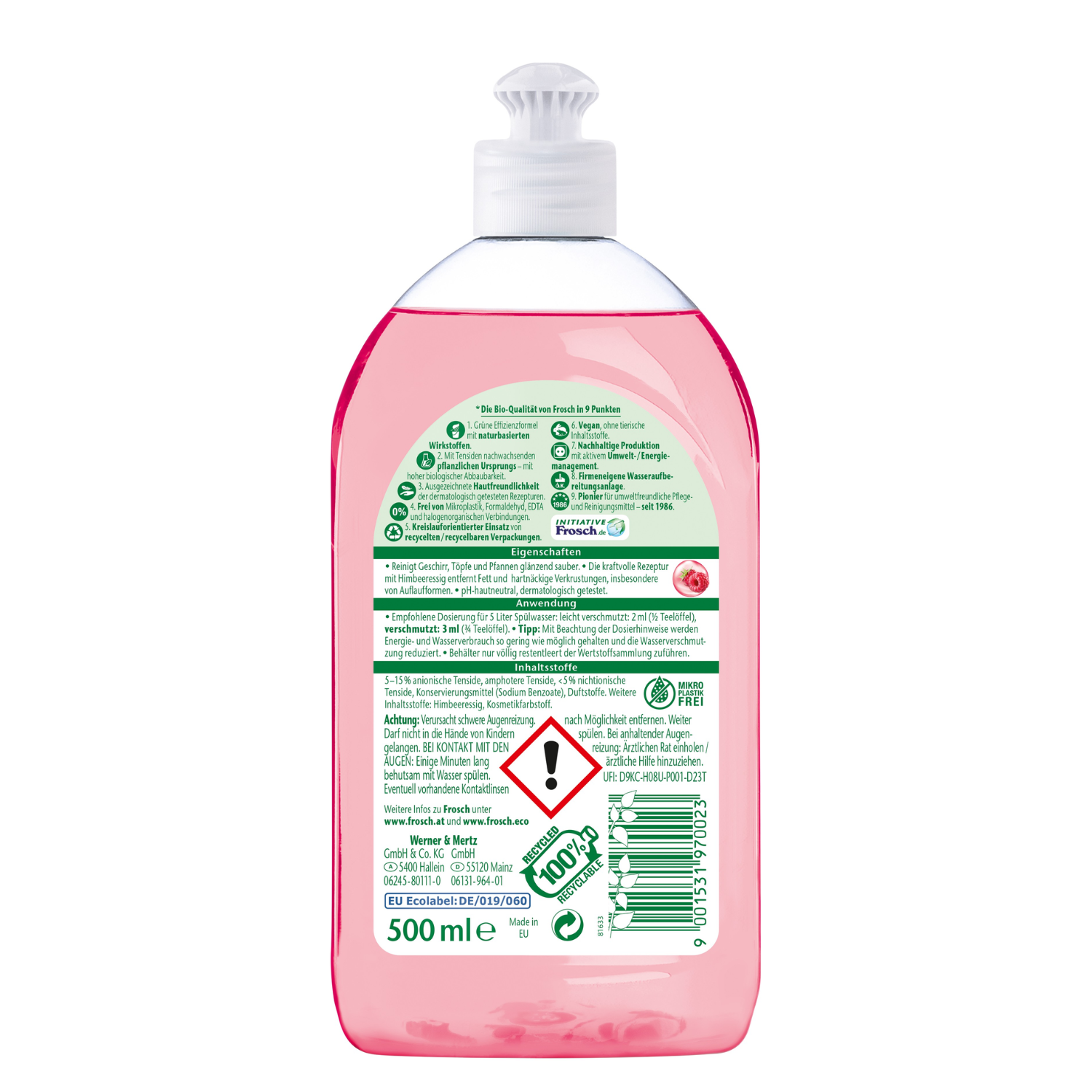 Formulat cu surfactanți pe bază de plante dizolvă chiar și reziduurile de grăsime și crustele persistente și lasă în urmă mirosul proaspăt si natural de zmeură. Compatibilitatea foarte bună a lichidului de spălat vase cu pH neutru cu pielea a fost confirmată dermatologic.