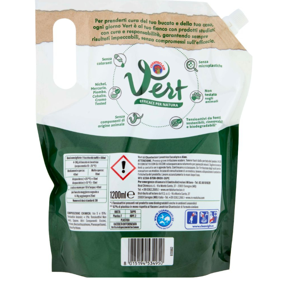 Detergent lichid Vert Eucalipt & Aloe este un detergent ecologic concentrat pentru masina de spalat, conceput pentru curatarea eficienta a rufelor si protejarea mediului. Formula sa cu extract de eucalipt si aloe indeparteaza murdaria si petele dificile, oferind in acelasi timp prospetime naturala hainelor. Datorita formulei ultra concentrate, produsul este eficient chiar si la temperaturi scazute sau in cicluri scurte de spalare.