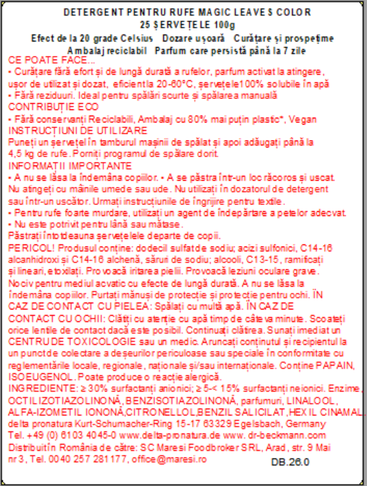 Detergent rufe Magic Leaves Color Dr. Beckmann – curățare eficientă de la 20°C, fără reziduuri, cu parfum care persistă până la 7 zile. Ambalaj reciclabil, ușor de folosit, ideal pentru rufe colorate.