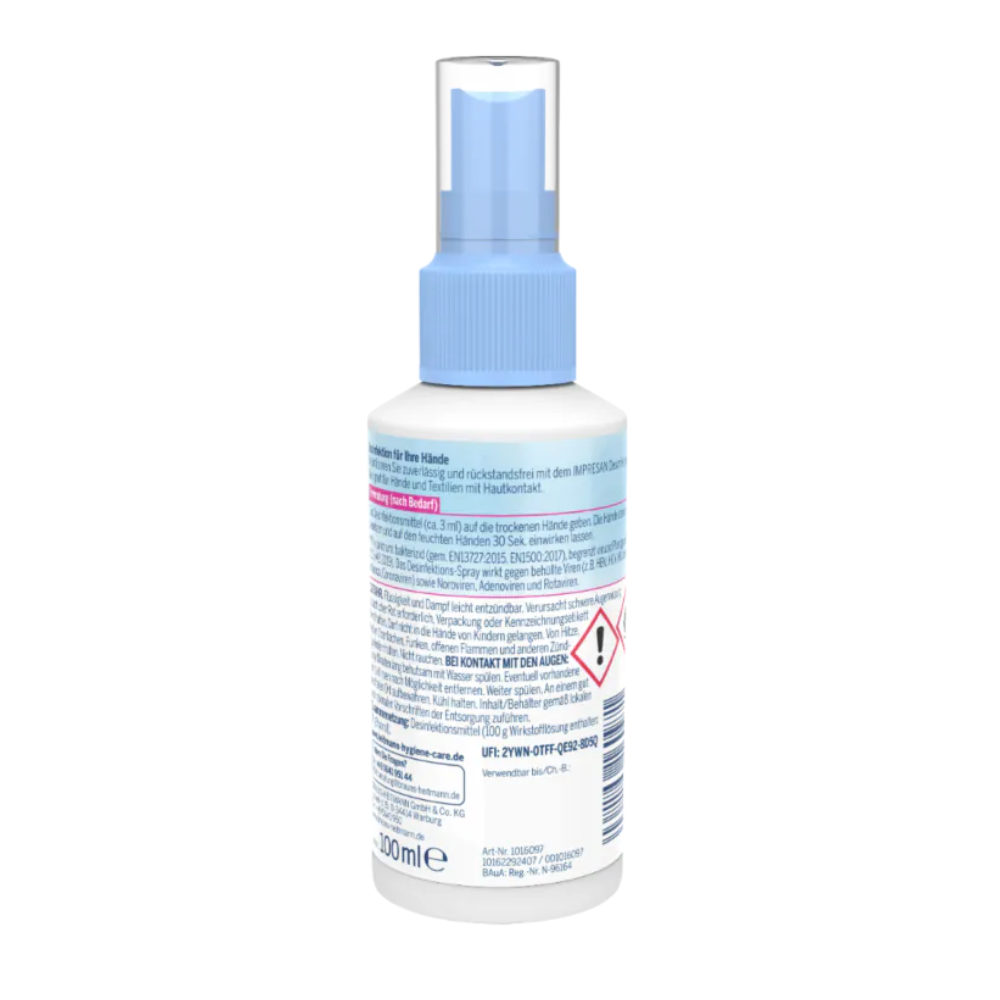 Spray dezinfectant pentru maini Impresan este o solutie eficienta pentru igienizarea rapida a mainilor si a textilelor care intra in contact direct cu pielea si pot fi umezite. Formula pe baza de alcool actioneaza rapid, fara a lasa reziduuri, fiind potrivita pentru utilizare zilnica.