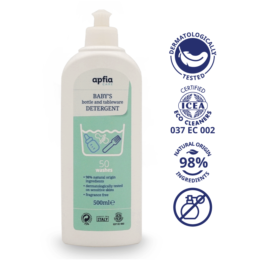 Apfia Care Detergent lichid pentru biberoane și veselă este special conceput pentru spălarea delicată a biberoanelor, suzetelor, jucăriilor și accesoriilor pentru hrana bebelușilor. Formula sa este fără parfum, realizată din 98% ingrediente de origine naturală, fiind testată dermatologic și sigură pentru pielea sensibilă a celor mici.