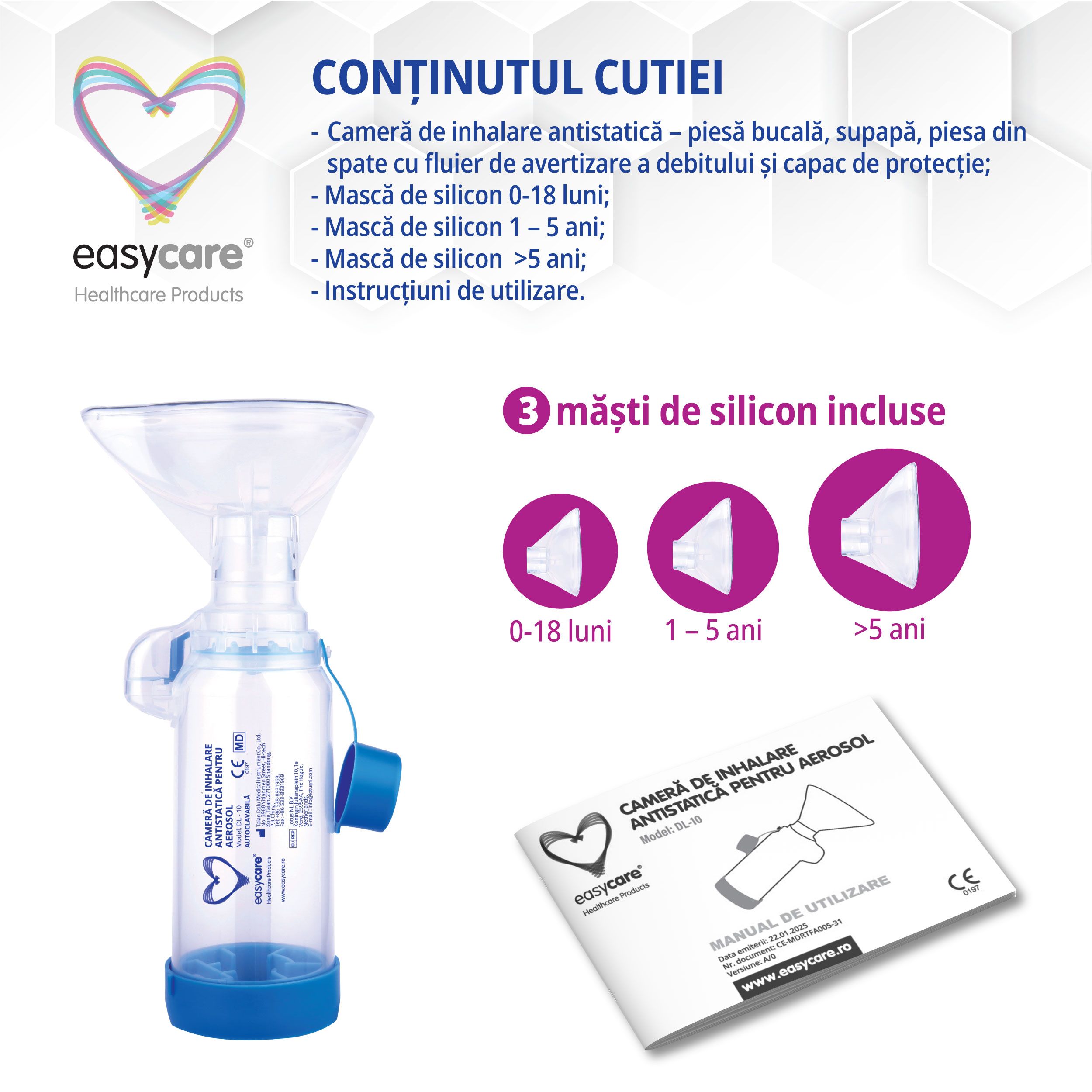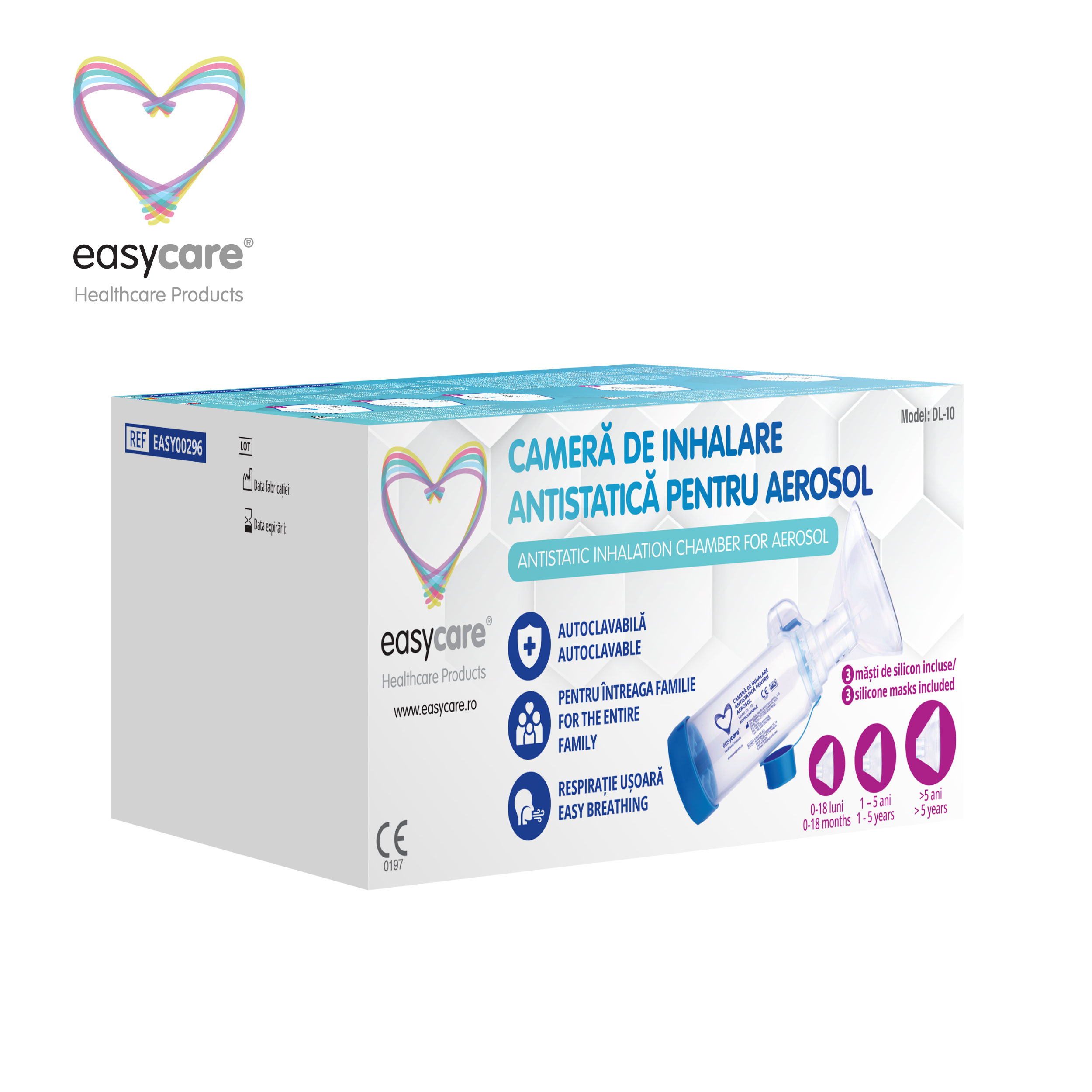 EasyCare DL-10 este o cameră de inhalare antistatică, destinată administrării eficiente a tratamentelor prin aerosoli. Dispozitivul este conceput pentru a facilita inhalarea corectă a medicamentelor sub formă de aerosoli, fiind potrivit pentru utilizare la copii și adulți, în funcție de masca utilizată.