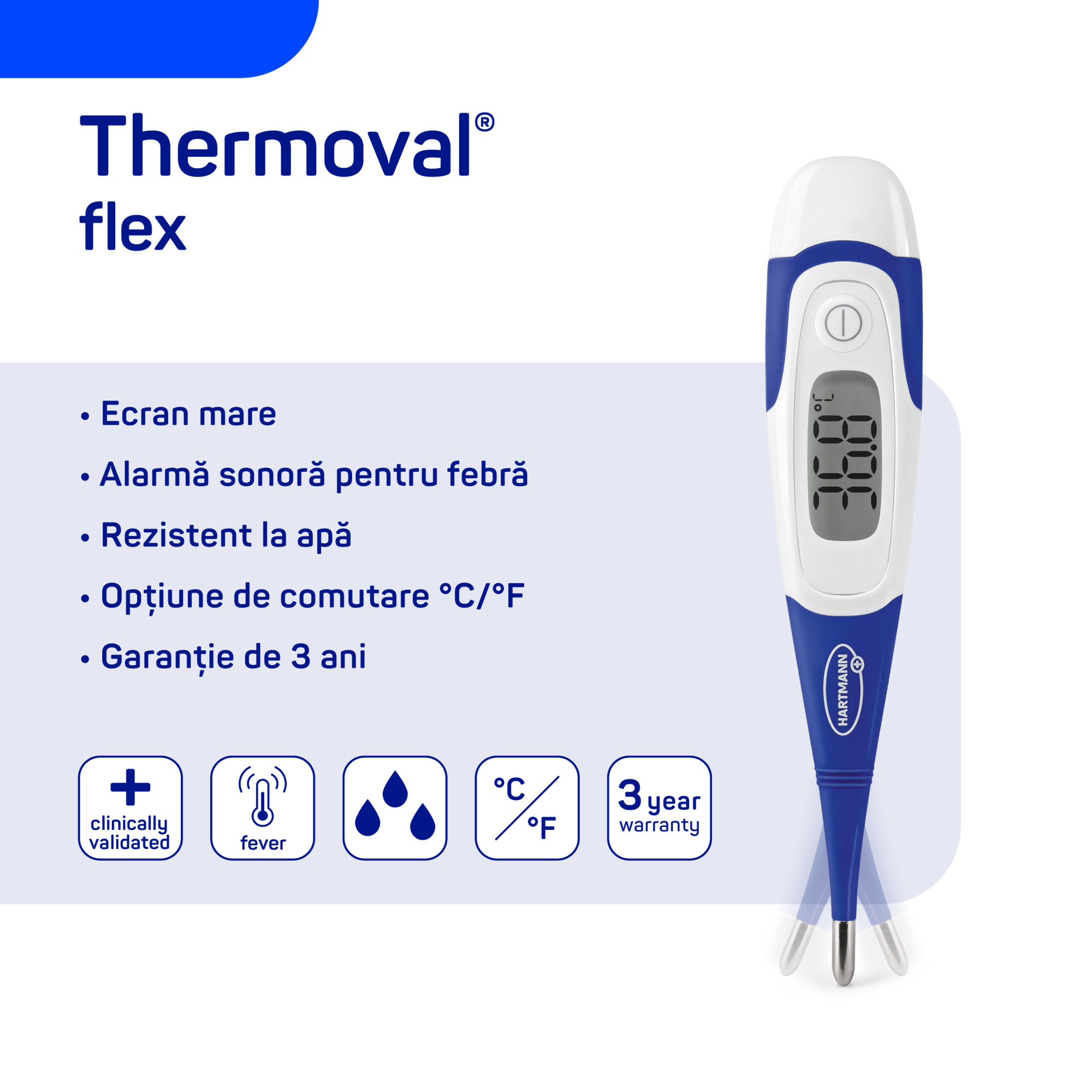 Thermoval Flex este un termometru digital modern, dezvoltat de PAUL HARTMANN, destinat măsurării rapide, precise și sigure a temperaturii corporale.