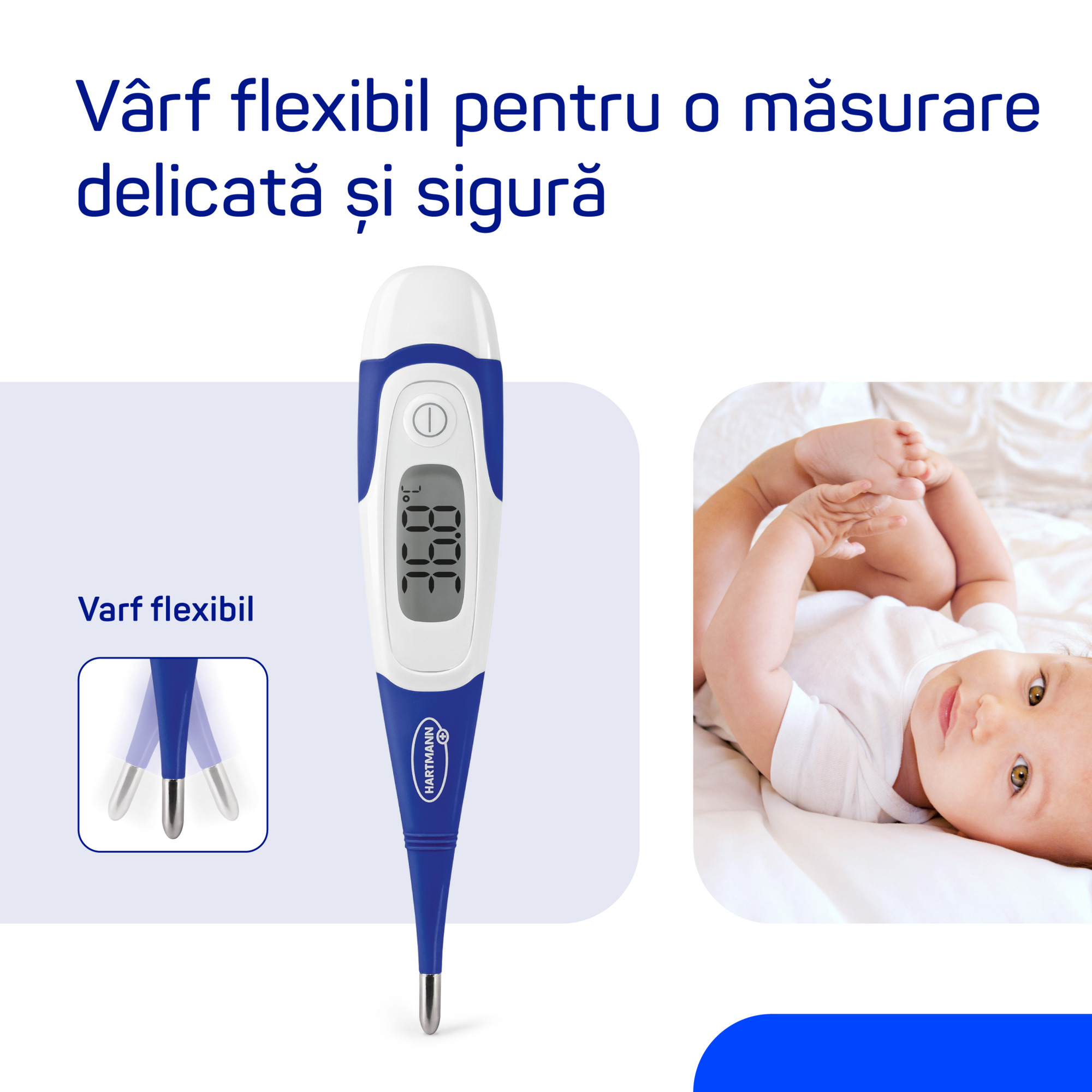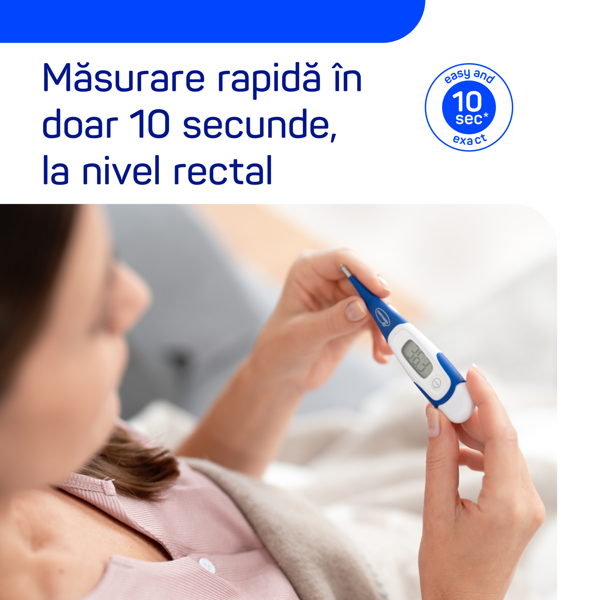 Datorită vârfului flexibil, dispozitivul oferă confort sporit, siguranță și risc redus de accidentare, fiind ideal inclusiv pentru copii și nou-născuți. Afișajul LCD clar, semnalul acustic de febră, memoria ultimei măsurători și tehnologia de măsurare rapidă fac din Thermoval Flex un instrument fiabil pentru monitorizarea sănătății.