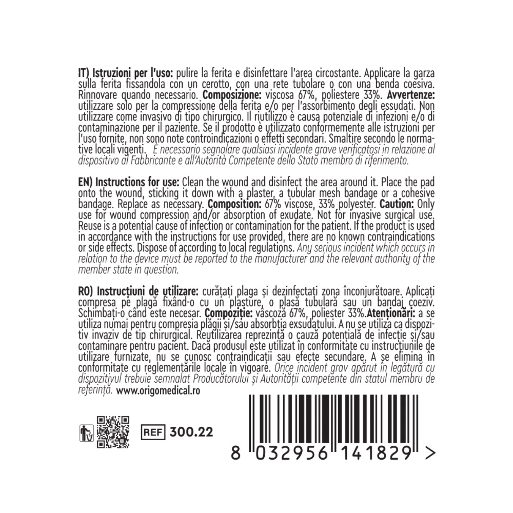 Instrucțiuni de utilizare: curățați plaga și dezinfectați zona înconjurătoare. Aplicați compresa pe plagă fixând-o cu un plasture, o plasă tubulară sau un bandaj coeziv. Schimbați-o când este necesar.