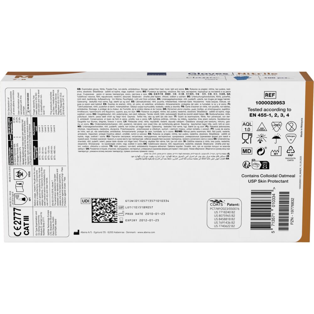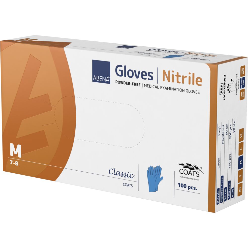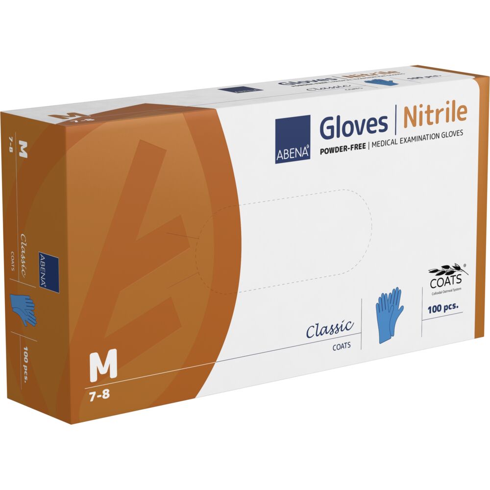 Mănușile de examinare ABENA COATS sunt concepute special pentru a proteja pielea mâinilor în cazul utilizării frecvente a mănușilor de unică folosință. Acestea sunt fabricate din nitril elastic, fără latex, și sunt prevăzute cu un strat interior inovator pe bază de fibre naturale de ovăz, care ajută la menținerea echilibrului natural de hidratare al pielii.