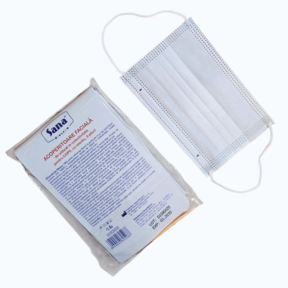Eficiență de filtrare: 70% pentru eficiența filtrării la particule în jur de 3(±0.5)µm conform ISO 16890-2. Acoperitoare facială de utilizat în colectivitate, create special pentru copii. Nu este potrivită pentru copiii sub 3 ani. Acoperitoare facială cu 3 pliuri. Se adaptează perfect pe forma feței.