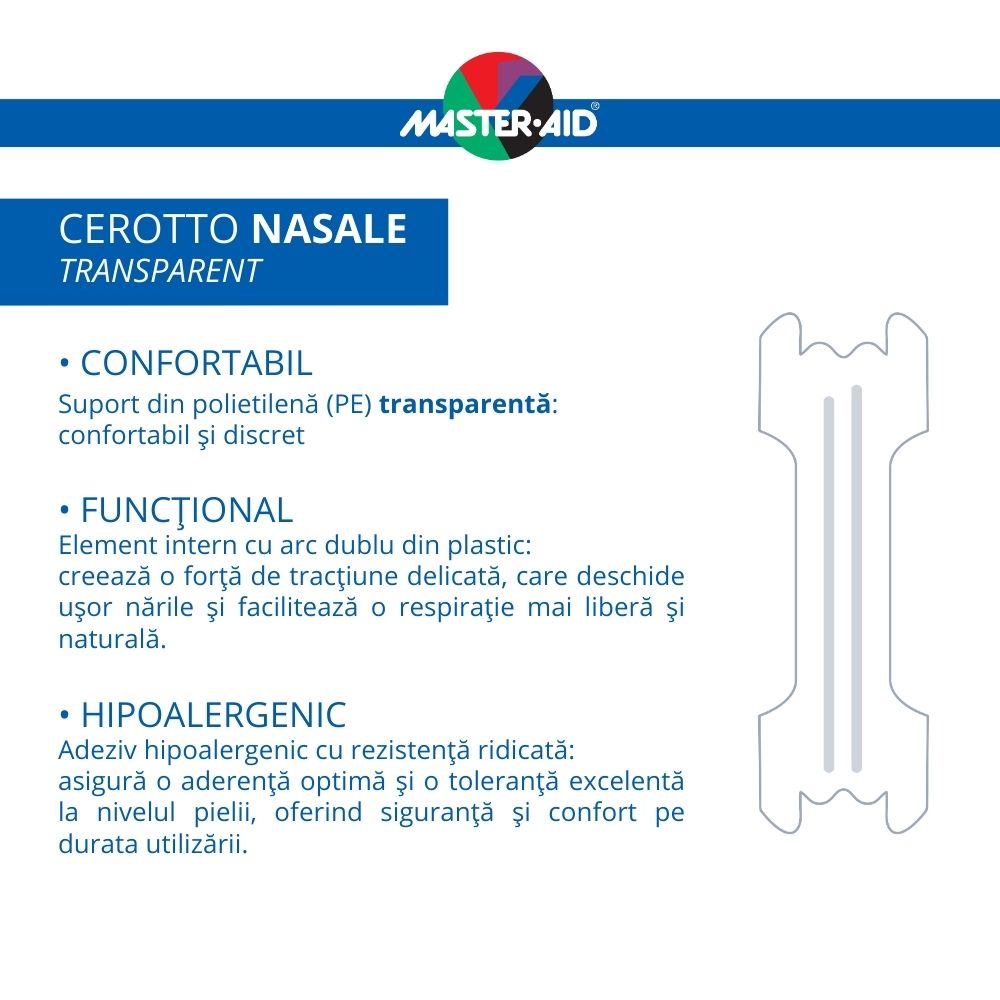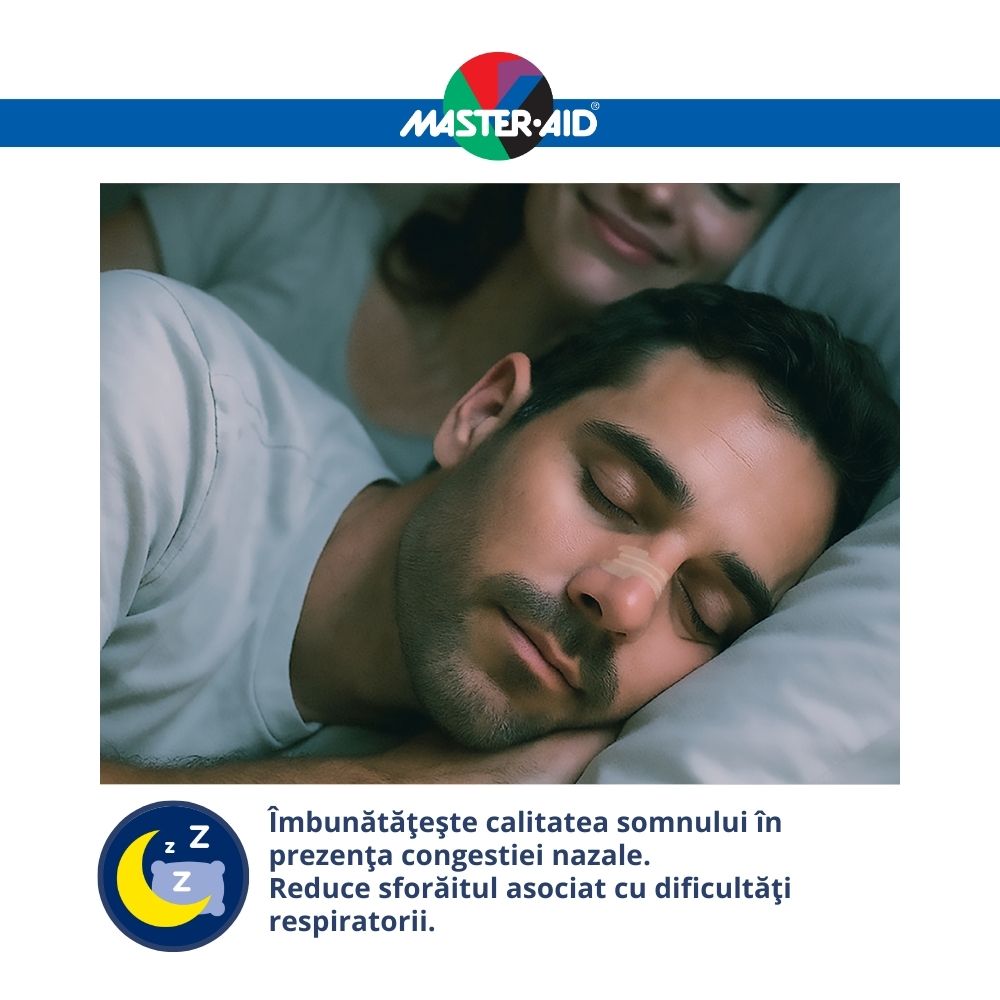 Plasturele nazal Master-Aid este un dispozitiv medical conceput pentru a imbunatati respiratia nazala in cazul congestiei temporare sau cronice. Prin actiunea mecanica delicata, plasturele ajuta la largirea cailor respiratorii nazale, facilitand respiratia naturala pe nas. Este recomandat in situatii precum raceala, alergii, deviatie de sept, dar si pentru reducerea sforaitului cauzat de respiratia dificila. Util atat pe timp de noapte, pentru un somn mai odihnitor, cat si in timpul activitatilor sportive, plasturele nazal Master-Aid ofera o solutie simpla, eficienta si non-invaziva.