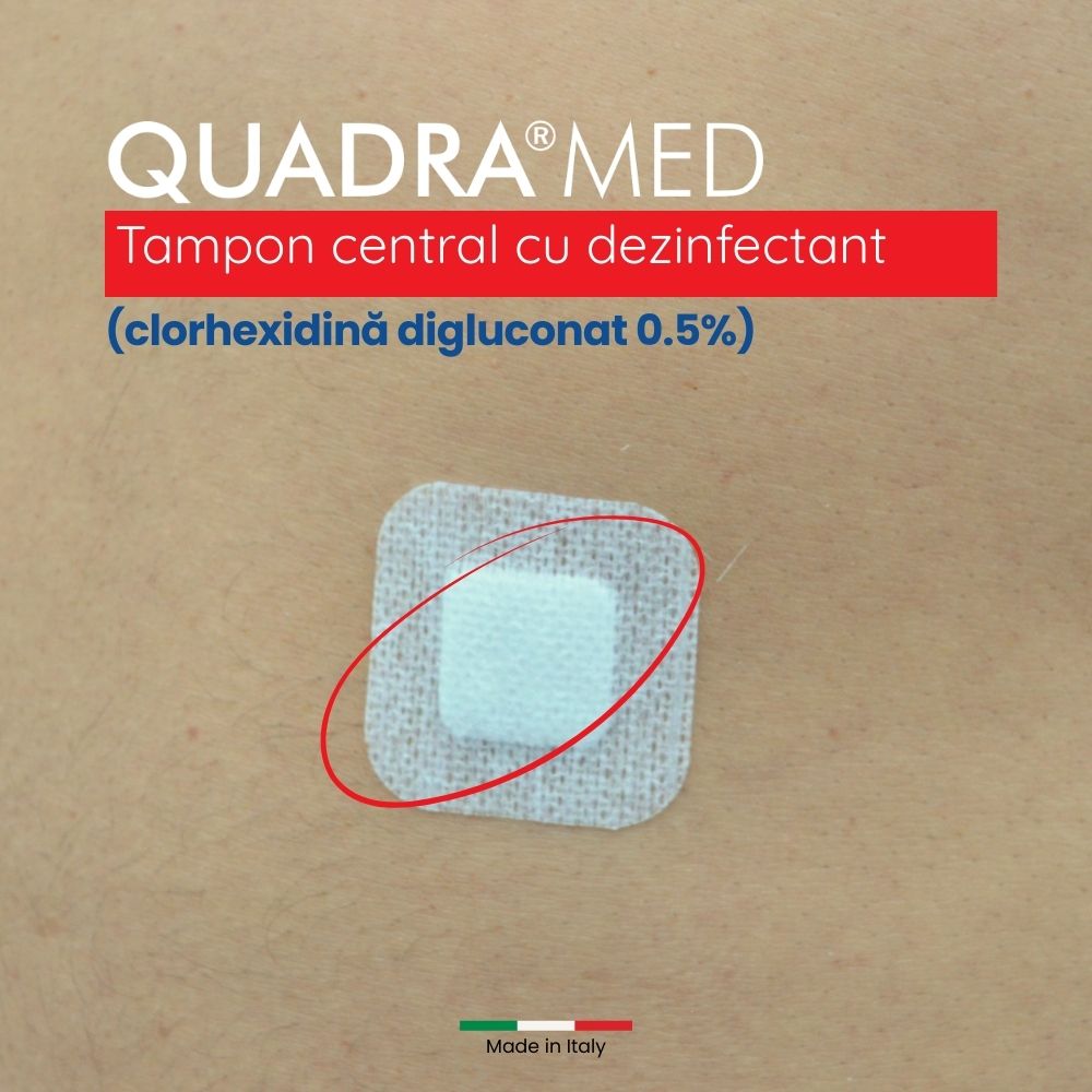 Tampon central din material netesut de grad medical, care conține antiseptic, clorhexidină digluconat 0.5%