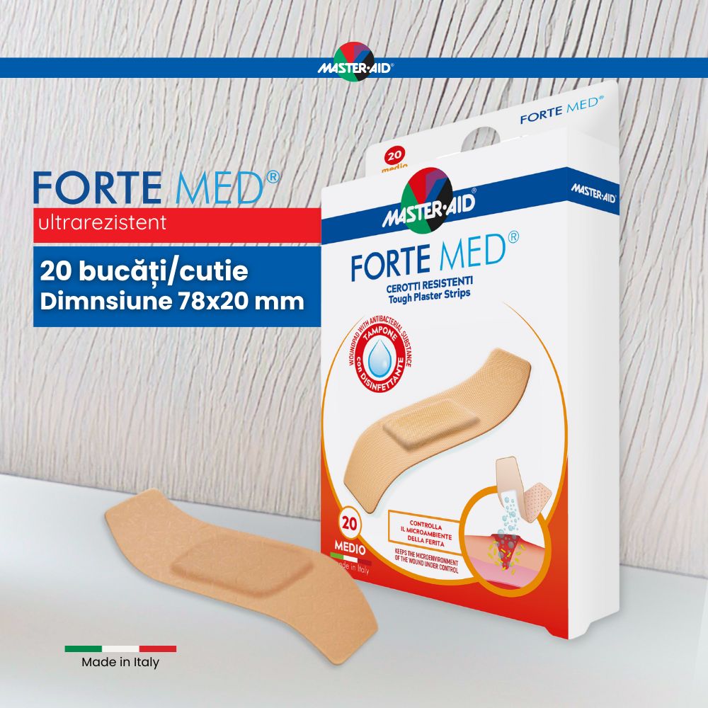 Ultima actualizare a informatiilor de prezentare pentru Plasturi ultra rezistenti Forte Med, 78x20 mm, 20 bucati, Master-Aid a fost efectuata la data de 14-11-2025.  |  Raporteaza Descriere Gresita
