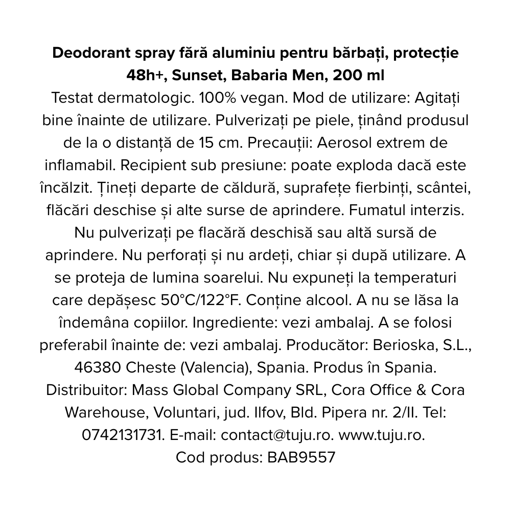 Simte energia unui apus cu deodorantul spray pentru bărbați Babaria Men Sunset, creat pentru a oferi prospețime și protecție de lungă durată. Formula sa fără aluminiu asigură protecție eficientă 48h împotriva mirosurilor neplăcute, menținând pielea hidratată, confortabilă și parfumată pe tot parcursul zilei. Aroma citrus fresh, inspirată de căldura unui apus, oferă o senzație revigorantă și masculină.