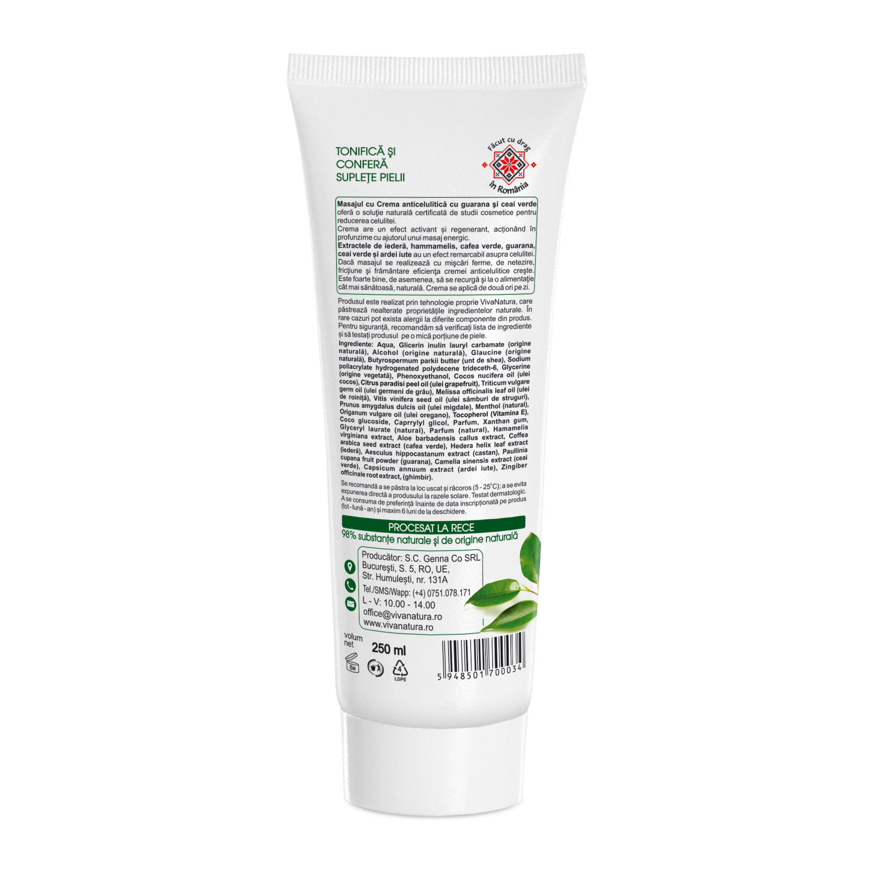 Cremă anticelulitică Vivanatura cu guarana și ceai verde este o formulă naturală (98% ingrediente de origine naturală), special creată pentru reducerea aspectului de „coajă de portocală” și tonifierea pielii. Conține ingrediente active cu efect termoactiv – guarana, ardei iute, cafea verde, ceai verde, iederă și castan – care stimulează microcirculația, activează metabolismul celular și favorizează arderea grăsimilor.