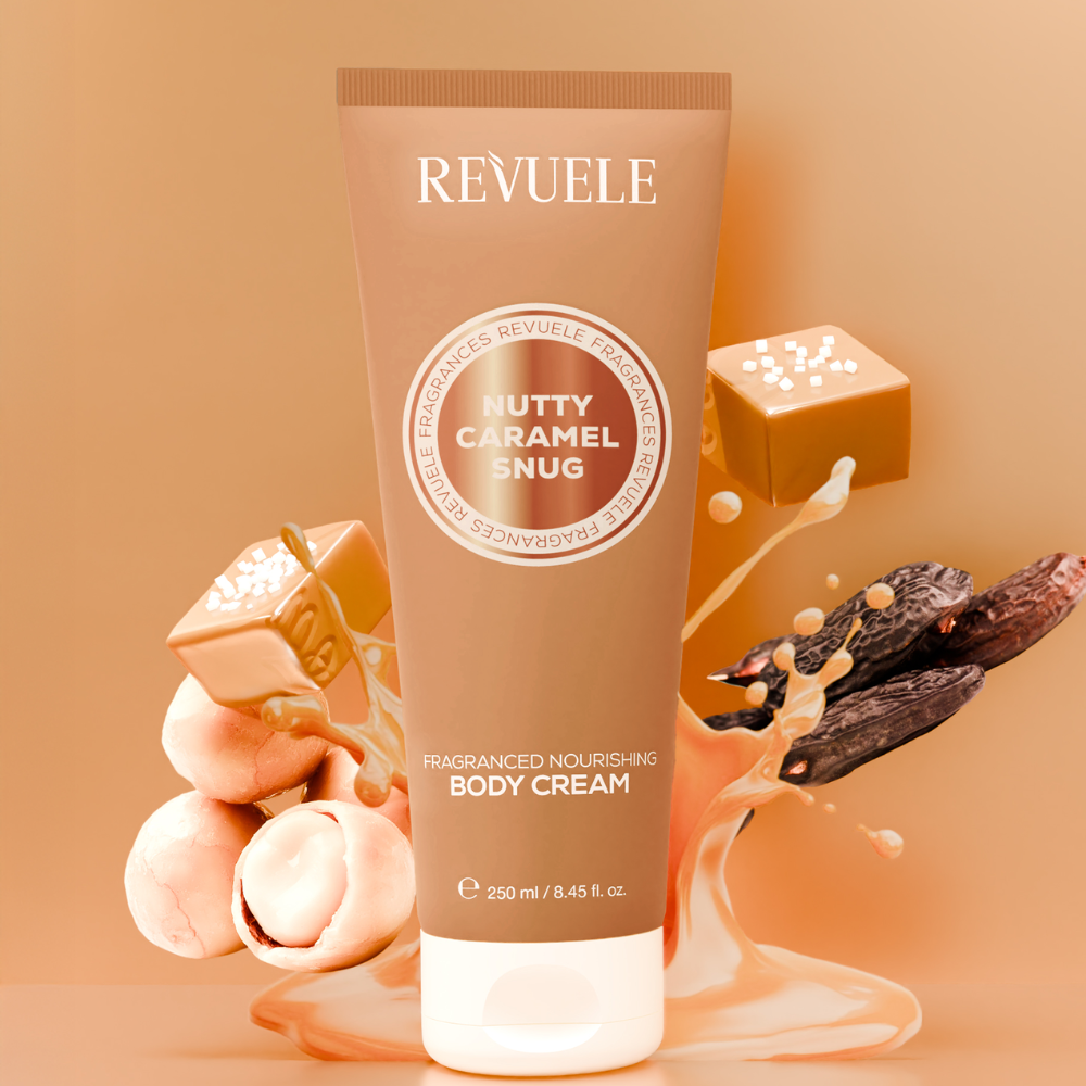Loțiunea de corp nutritivă Revuele Nutty Caramel Snug este un adevărat răsfăț pentru piele și simțuri. Cu o textură bogată și cremoasă, se topește delicat pe piele, oferind o hidratare profundă și de lungă durată. Formula sa hrănitoare calmează pielea uscată și redă senzația de confort, catifelare și suplețe.