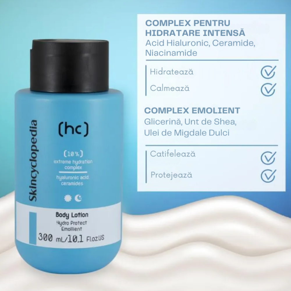 Loțiune corp 10% Hydration Complex, Skincyclopedia – formulă intensivă cu acid hialuronic, ceramide și panthenol, pentru o hidratare profundă și refacerea barierei pielii. Potrivită pentru toate tipurile de piele, inclusiv pielea uscată, sensibilă sau deshidratată. Textura lejeră și absorbția rapidă oferă confort imediat, fără peliculă grasă. Ideală pentru îngrijirea zilnică a pielii, cu efecte vizibile de la prima aplicare: piele mai moale, netedă și suplă.