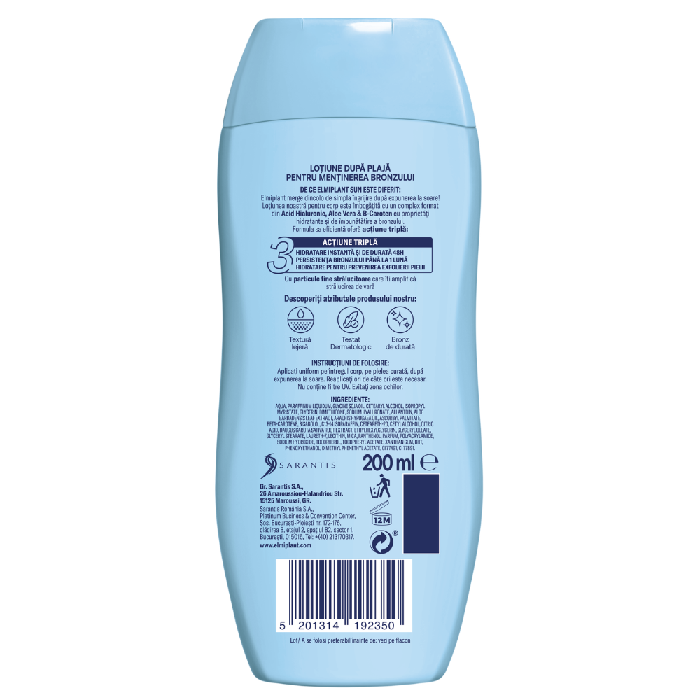 Elmiplant Lotiune dupa plaja pentru mentinerea bronzului este o formula hidratanta si iluminatoare, conceputa pentru a prelungi intensitatea bronzului si a mentine pielea catifelata. Imbogatita cu acid hialuronic, aloe vera si beta-caroten, ofera hidratare de durata si un efect subtil stralucitor.