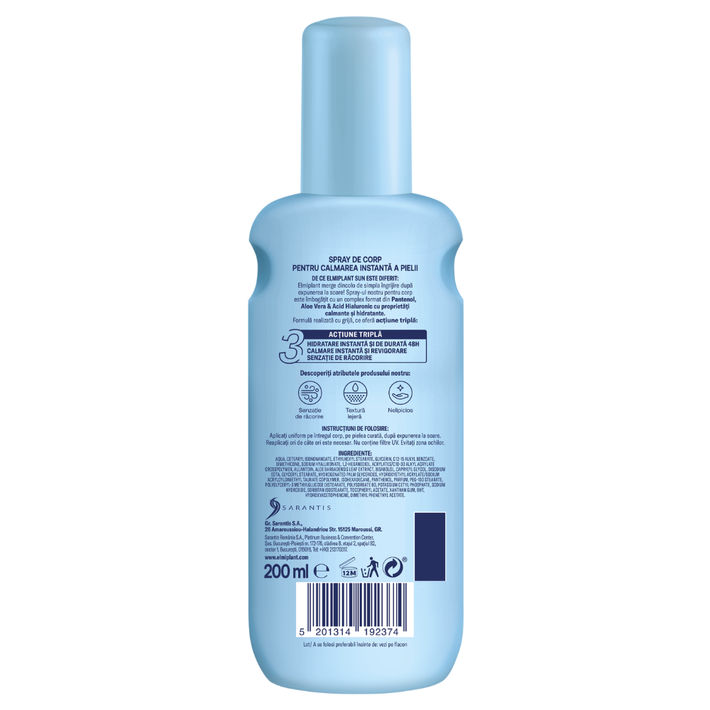 Elmiplant Lotiune Spray Dupa Plaja este solutia ideala pentru ingrijirea pielii dupa expunerea la soare, oferind hidratare, calmare si efect racoritor. Formula sa este imbogatita cu Pantenol, Aloe Vera si Acid Hialuronic, pentru a reda confortul si supletea pielii.