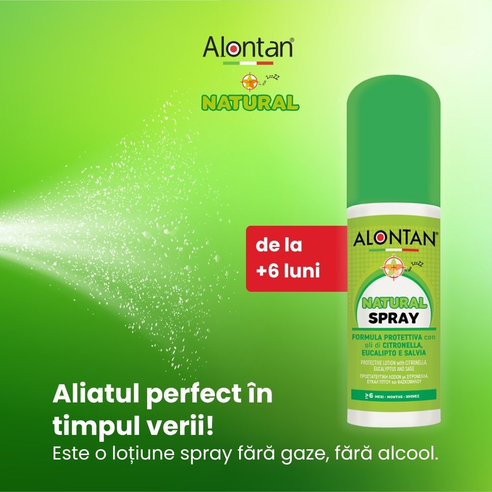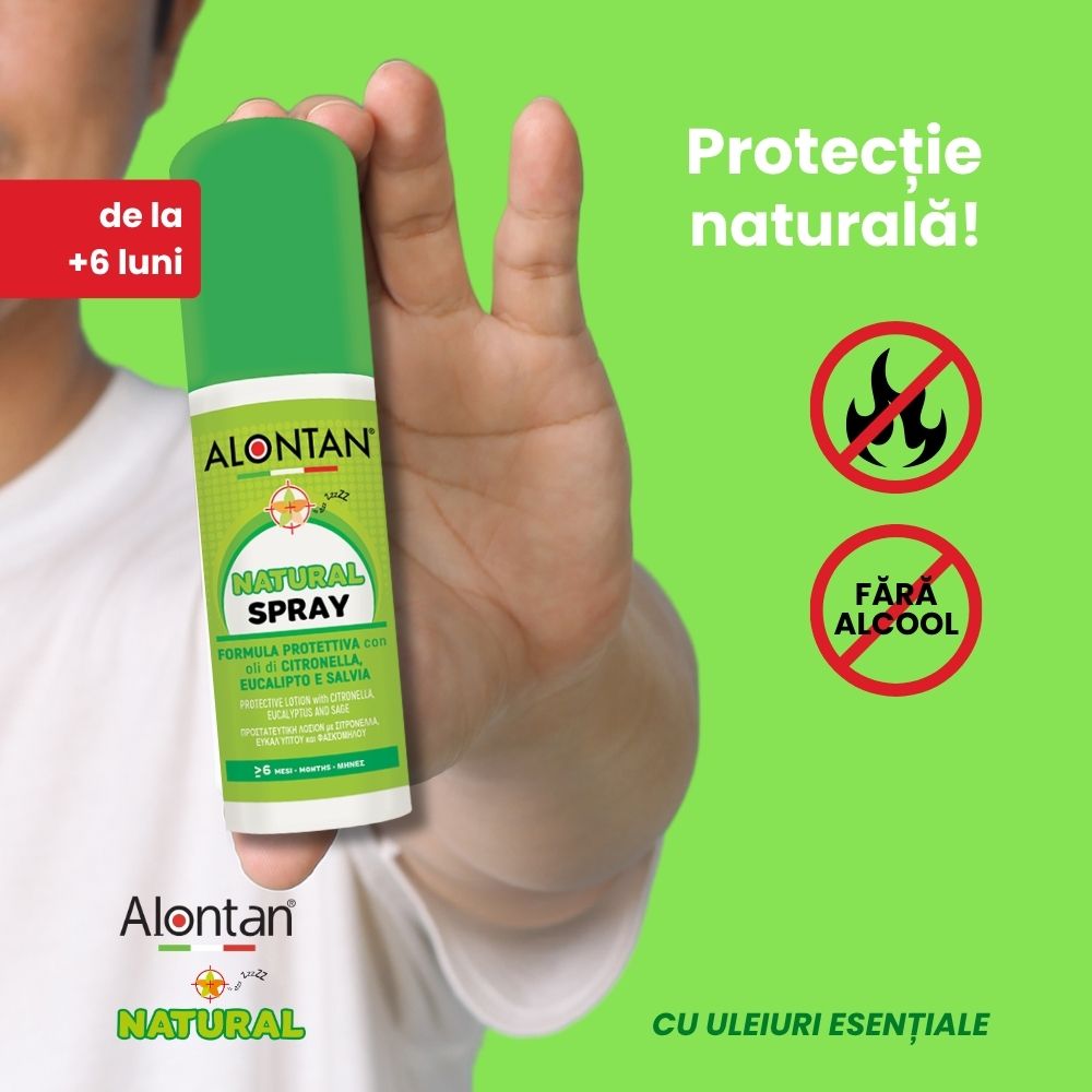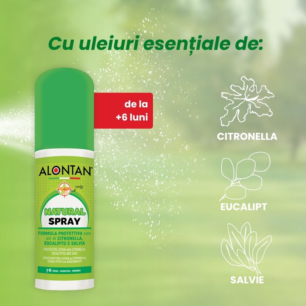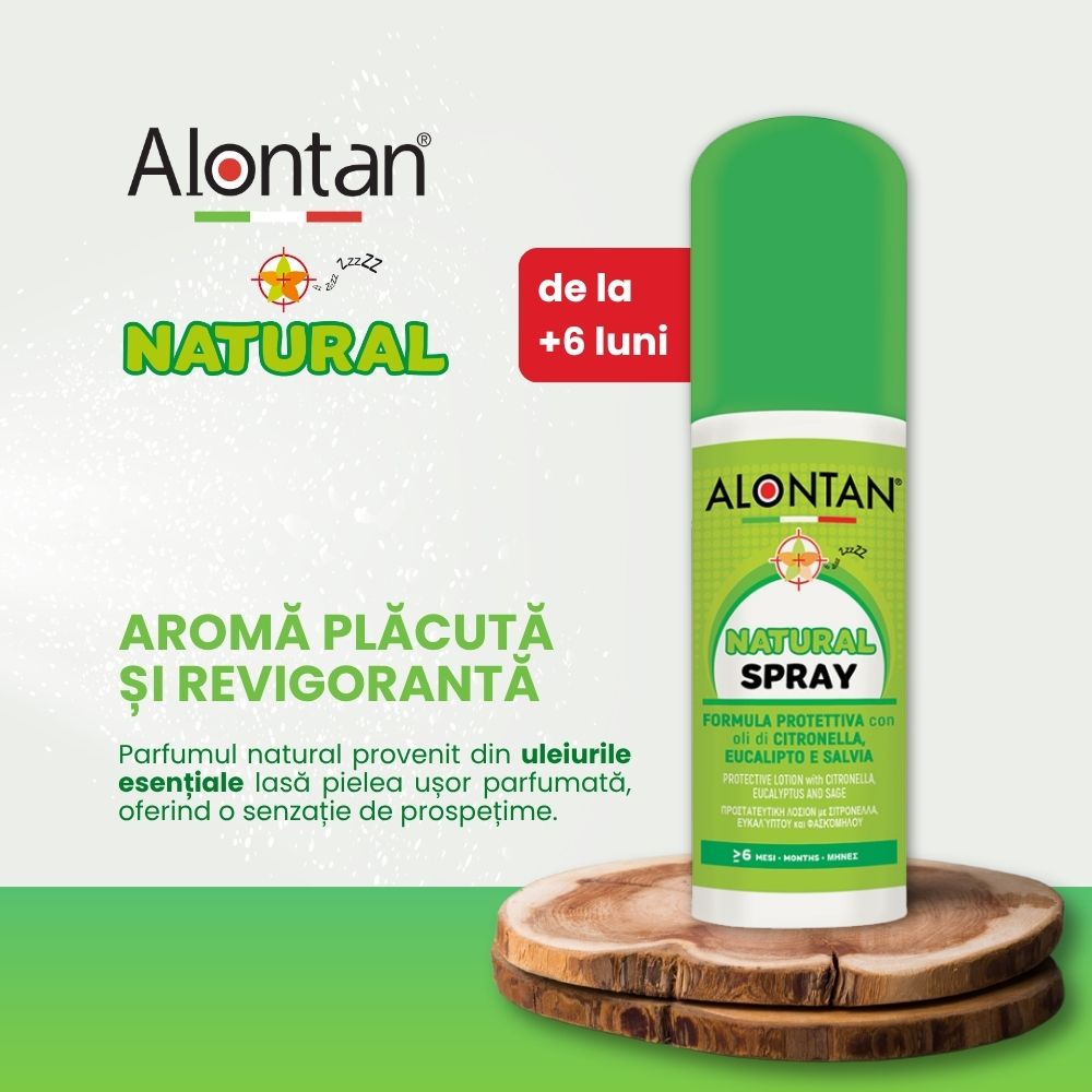 Alontan Natural este o loţiunea de protecție ce prezintă o formulă compusă din uleiuri de origine vegetală extrase din plante și flori precum citronella, eucalipt și salvie. Produsul lasă pielea proaspetă și parfumată fără a o îngreuna datorită prezenței mentolului și a hialuronatului de sodiu.