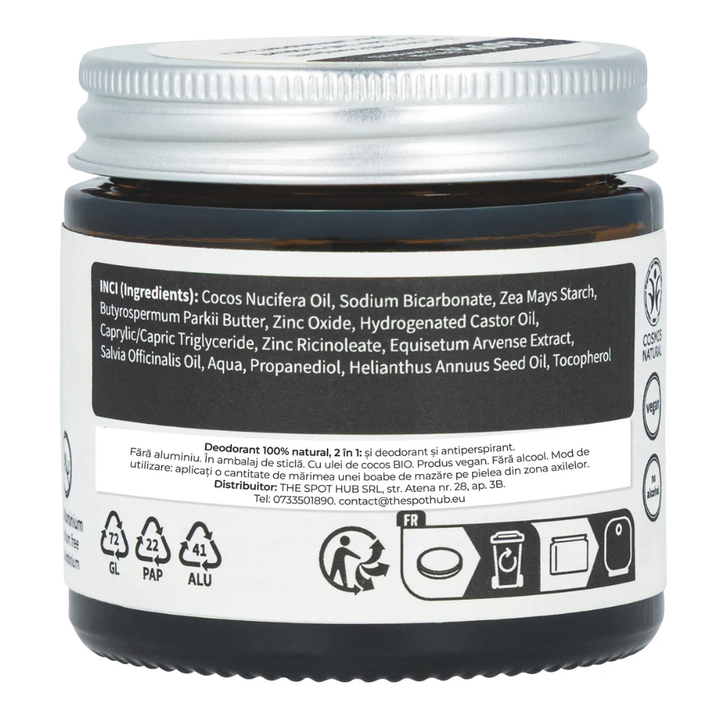 Deodorant-cremă 100% natural, fără parfum, fără aluminiu și fără alcool.