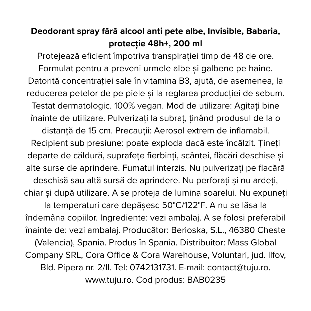 Ultima actualizare a informatiilor de prezentare pentru Deodorant spray fara alcool anti pete albe Invisible, 200 ml, Babaria a fost efectuata la data de 20-04-2026.  |  Raporteaza Descriere Gresita