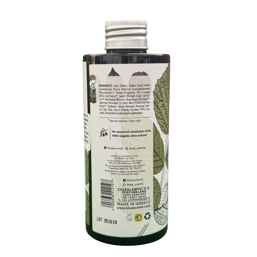 Aqua (Water), Sodium Coceth Sulfate, Cocoamidopropyl Betaine, Disodium Cocoamphodiacetate, Polyquaternium 7, Parfum (Fragrance), Olea Europaea (Olive) Leaf Extract*, Salvia Officinalis (Sage) Leaf Extract*, Rosmarinus Officinalis (Rosemary) Leaf Extract*, Hypericum Perforatum (St. John’s Wort) Flower/Leaf/Stem Extract*, Panthenol, Sodium Benzoate, Potassium Sorbate, Glycerin, Citric acid, Sodium Chloride, Disodium EDTA, Coumarin