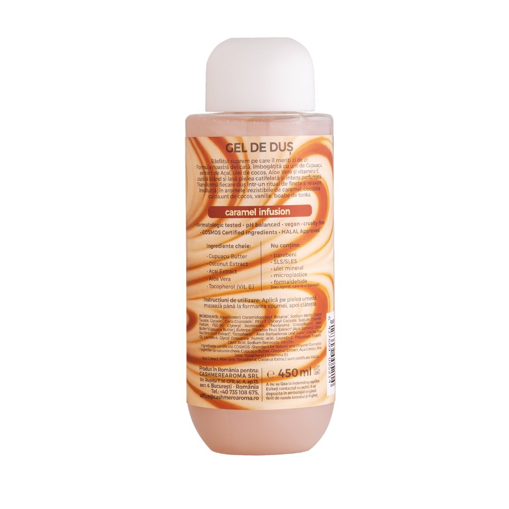 Caramel Infusion Gel de dus este alegerea perfecta pentru un ritual zilnic de rasfat, cu o formula delicata ce curata bland si lasa pielea catifelata, hidratata si invaluita intr-un parfum intens de caramel, ciocolata calda, unt de cocos, vanilie si boabe de tonka. Imbogatit cu unt de Cupuacu, extract de Acai, ulei de cocos, Aloe Vera si vitamina E, acest gel de dus transforma fiecare dus intr-o experienta senzoriala luxurianta.