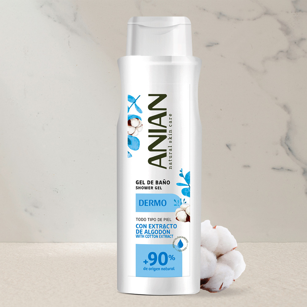 Anian Dermo este un gel de duș cu extract de bumbac și glicerină, potrivit pentru toate tipurile de piele. Curăță pielea și contribuie la o îngrijire delicată, pentru o senzație plăcută după duș.