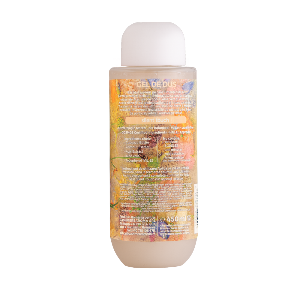 Gelul de dus Silent Touch ofera o experienta luxurianta de ingrijire, combinand o formulare delicata cu ingrediente botanice nutritive si un parfum senzorial ce transforma rutina zilnica intr-un ritual de relaxare. Imbogatit cu unt de Cupuacu, extract de Acai, ulei de cocos, Aloe Vera si vitamina E, acest gel de dus curata bland, hidrateaza intens si lasa pielea fina, elastica si invaluita intr-un parfum sofisticat de piersica alba, floare de portocal, vetiver, ambroxan si mosc. Ideal pentru toate tipurile de piele, chiar si pentru cele sensibile.